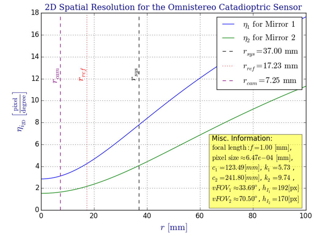 In this work, we performed an extensive study of the proposed omnistereo sensor’s properties, such as its spatial resolution and triangulation uncertainty. We validated the projection accuracy of the synthetic model (the ideal case) where 3D points in the world are given exactly. In order to validate the precision of the real sensor, we require a perfectly constructed and assembled device so point projections can be accepted as the ultimate truth. This is hard to achieve at a low-cost prototyping stage. Although we acquired ground-truth 3D points via a position capture system alone, we deem this insufficient to validate the imaging accuracy of the real sensor because the precision of the calibration method is truly what is being accounted for. For reproducibility purposes, source code is available for the implementation of the theoretical omnistereo model, optimization, plots and figures presented in this analysis [40].
