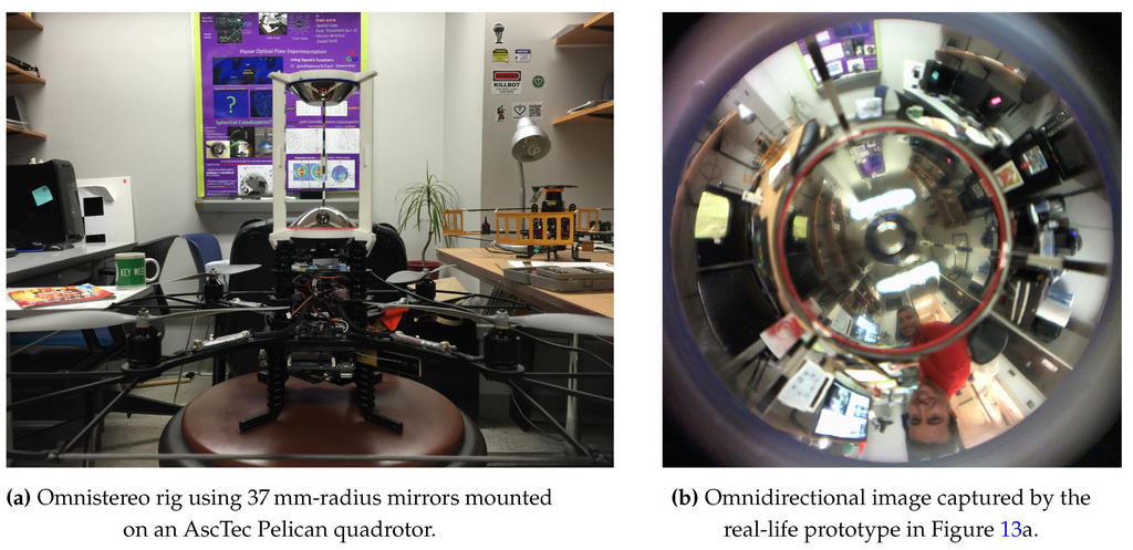 Our ongoing research is also focusing on the development of efficient software algorithms for real-time 3D pose estimation from point clouds. Bear in mind that all the experimental results demonstrated in this manuscript rely upon a single camera snapshot. We understand that the narrow vertical field-of-view where stereo vision operates is a limiting factor for dense scene reconstruction from a single image, so we have also considered non-optimal geometries for the quadrotor’s view. In fact, increasing the region of interest for stereo (SROI) while maintaining the wide baseline implies an enlargement of each mirror’s radius. We believe that our omnidirectional system is more advantageous than forward-looking sensors because it can provide a robust pose estimation by extracting 3D point features from all around the scene at once. As in our past work [24], fusing multiple modalities (e.g., stereo and optical-flow) is a possibility in order to resolve the scale-factor problem inherent while performing structure from motion over the non-stereo regions of each mirror (near the poles).