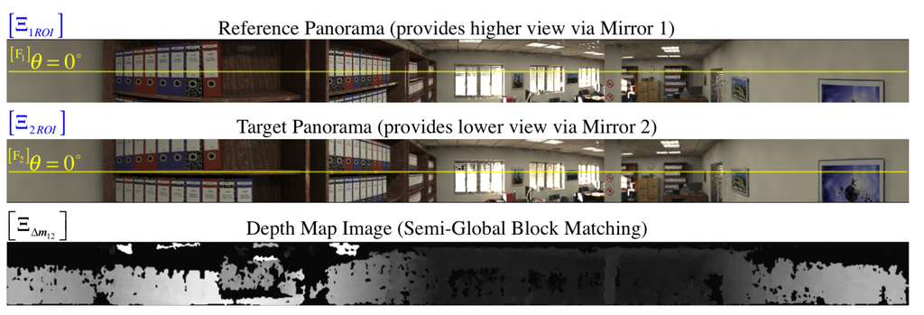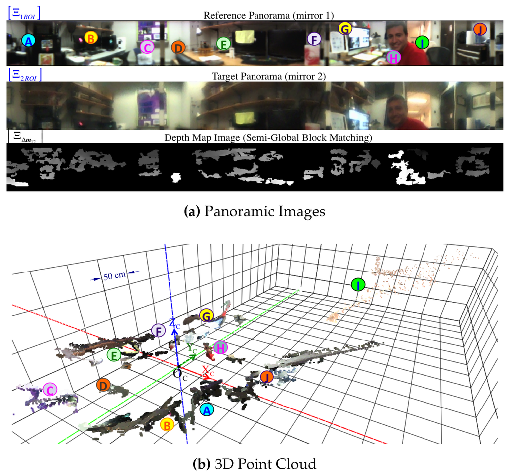 We also present results from a real experiment using the prototype described in Section 4.3.2 and shown in Figure 13a. The panoramic images and dense point cloud shown in Figure 21 are obtained by implementing the pertinent functions described throughout this manuscript and by holding the SVP assumption of an ideal configuration. We provide these qualitative results as preliminary proof of concept for the proposed sensor after employing a calibration procedure based on the generalized unified model proposed in [37].