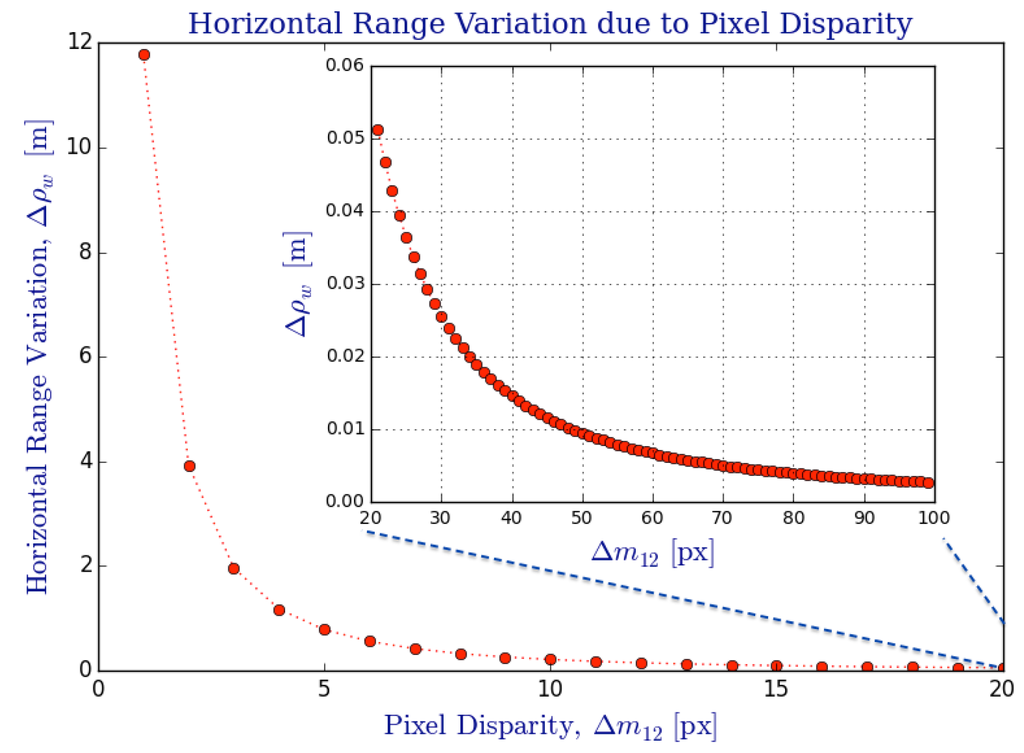 where we assume for the standard deviation of each pixel coordinate in the discretized pixel space. The complete symbolic solution of is too involved to appear in this manuscript. However, in Figure 18, we show the top-view of the covariance ellipsoid drawn at a three- level for a point triangulated nearly around . Figure 19 visualizes uncertainty ellipsoids drawn at a one- level for several triangulation ranges. We refer the reader to the end of Section 6.3 where we validate the safety of this 1 pixel deviation assumption through experimental results using subpixel precision.