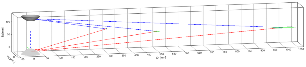 Assuming a central catadioptric configuration for the mirrors and camera system (Section 2.2), we derive the closed-form solution to the imaging process (forward projection) for an observable point , positioned in three-dimensional Euclidean space, , with respect to the reference frame, , as vector . In addition, we assume all reference frames such as and have the same orientation as .
