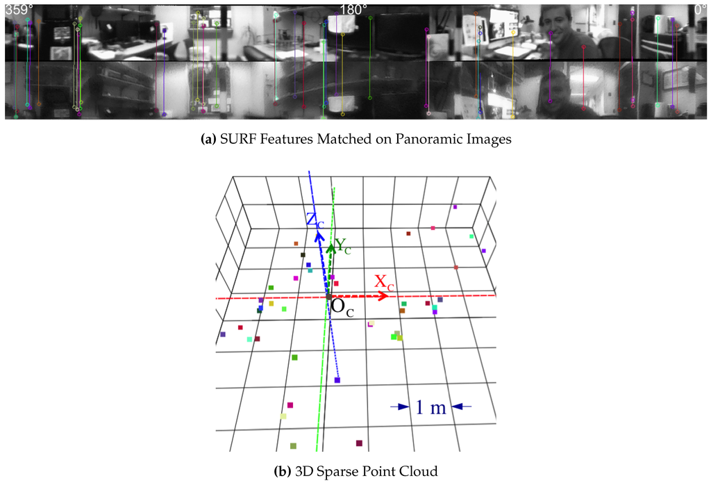 Using the SURF feature detector and descriptors [38], Figure 22 demonstrates 44 correct matches that are triangulated with Equation (93). Sparse 3D points can be useful for applications of visual odometry where the sensor changes poses and those registered point features can be matched against new images. Please, refer to [39] for a tutorial on visual odometry.