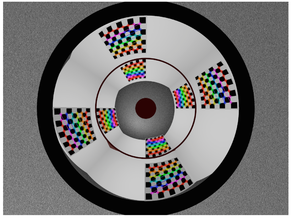 Example of sparse point correspondences detected with subpixel precision from corners on the chessboard patterns around the omnistereo sensor. The size of the rendered images for this experiment is 1280 × 960 pixels. For this example’s patterns, the square cell size is 140. The RMSE for this set of points at is approximately 15 (Table 4).