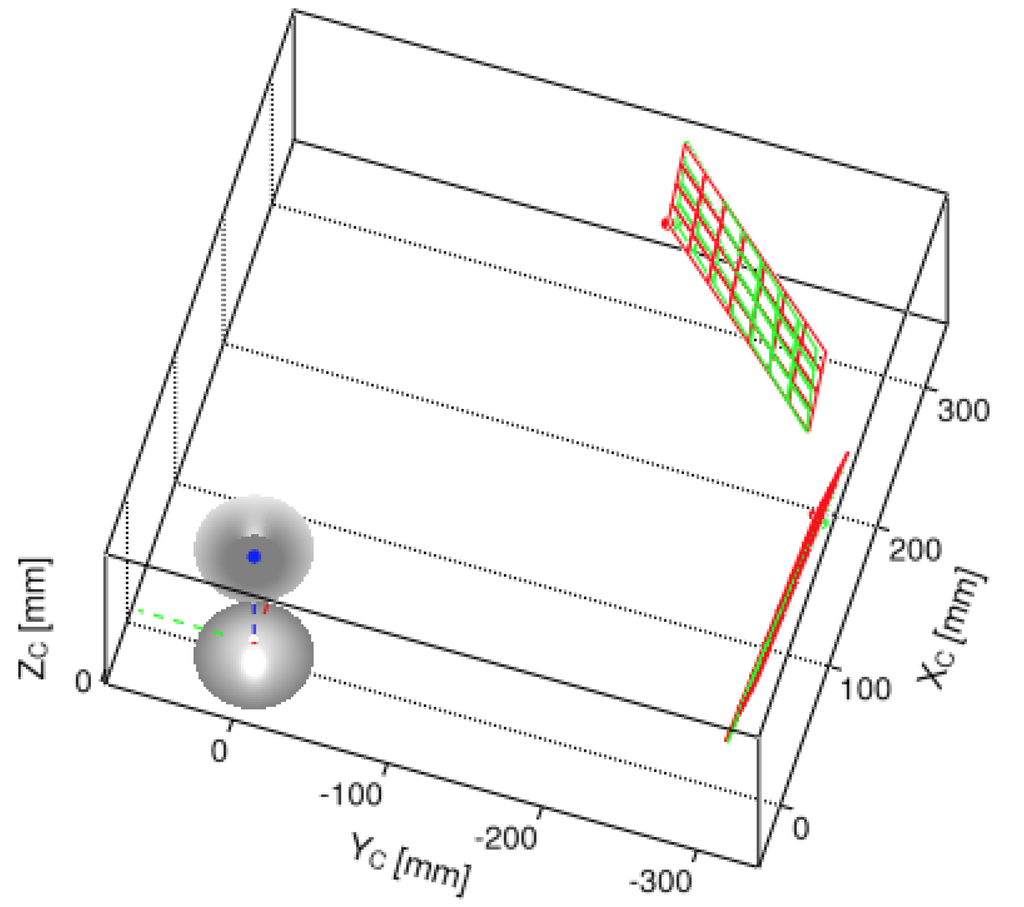 in order to project the real camera’s pinhole located at as a virtual camera coinciding with the virtual focal point positioned at . We achieve this by setting as the symmetrical distance from the reflex mirror to and from the reflex mirror to . With respect to , mirror 2’s primary focus, , results in position . It yields the following expression for the reflective plane:
