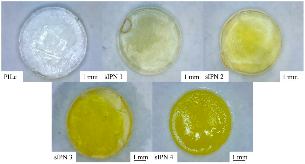 Another effect caused by the increasing quantity of linear copolymer in the PILc matrix is an observable increase in swelling area when the gels are left to hydrate in DI water (Figure 7, Table 3). The addition of linear p(NiPAAm-BSP-AA) increases the hydrophilic character of the hydrogels, because the co-monomers are hydrophilic molecules at room temperature.