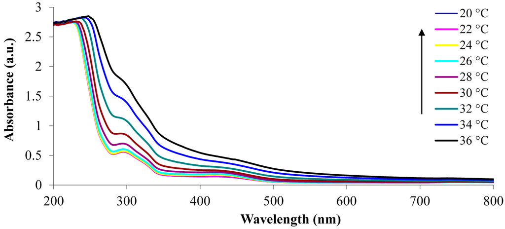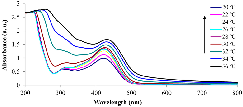 The same solution was then irradiated with white light (~250 kLux) for 5 min before the absorbance spectrum was recorded at each temperature (Figure 2). After the solution was irradiated, its colour changed from bright yellow to colourless, due to conversion of Mc-H+ to the closed SP form (Figure 3). This is confirmed by the decrease of the peak at 422 nm. The absorbance peak centred at 294 nm shown in Figure 3 due to the presence of the SP isomer, while the shoulder at ~316 nm probably indicates the presence of the SP-NH+ form [].