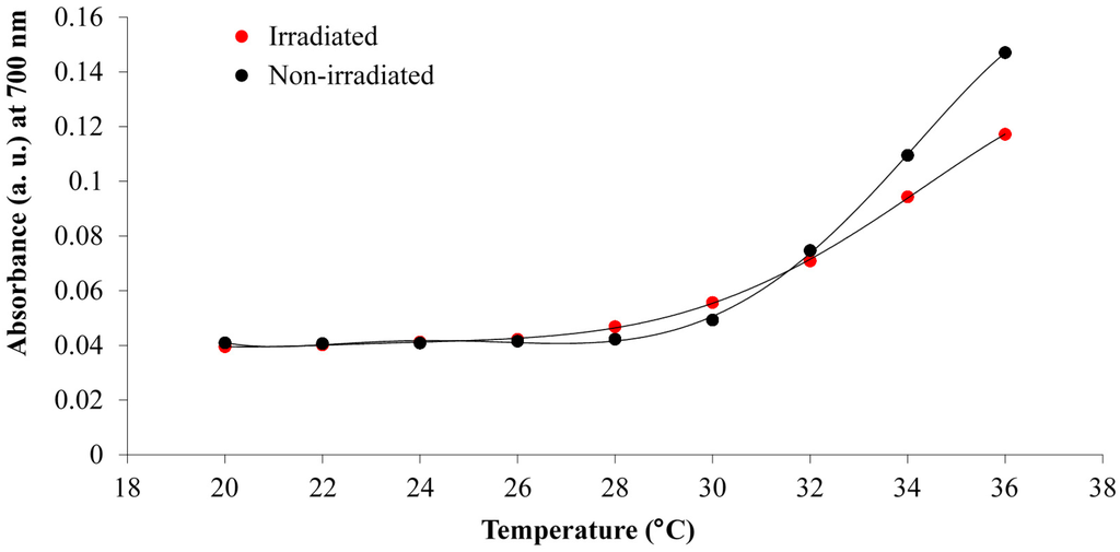 In Figure 4 the rise in absorbance at 700 nm between the non-irradiated and white light irradiated samples is compared. The absorbance at 700 nm for the white light irradiated solution begins to increase at a lower temperature (~28 °C) compared to the non-irradiated solution (~30 °C), which is in accordance with results reported previously by Sumaru et al. []. This phenomenon occurs because of the hydrophobicity increase of the polymer chains when irradiated with white light. The BSP form is more hydrophobic compared to Mc-H+, thus promoting the precipitation of the linear p(NiPAAm-BSP-AA) chains at a lower temperature []. After 32 °C, the non-irradiated solution absorbance crosses the irradiated solution absorbance, which can be explained by additional formation of J aggregates between the Mc-H+ molecules in the linear p(NiPAAm-BSP-AA) copolymer chains which facilitates chain precipitation.