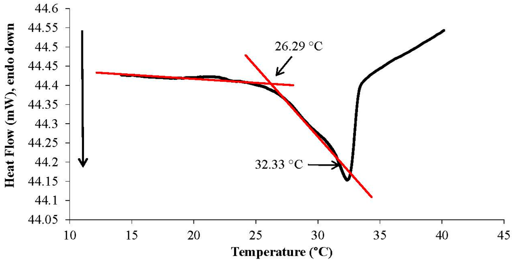 Following the qualitative analysis of the LCST, DSC was used to obtain quantitative data. The DSC analysis of the 2.5% linear copolymer w/w solution determined an onset temperature at 26.29 °C and a maximum peak temperature at 32.33 °C (Figure 5). The onset temperature corresponds to the temperature at which the solution starts to undergo the precipitation process, while the peak temperature corresponds to the temperature at which the system completely precipitates (i.e., the LCST). These results correlate with the UV-Vis measurements, showing in both cases that the linear copolymer starts to precipitate between 26–28 °C and continues up to 36 °C. Moreover, the DSC curve gives a very close LCST value to the 32–35 °C value quoted in literature for poly(N-isopropylacrylamide), the main component of the p(NiPAAm-BSP-AA) copolymer [].