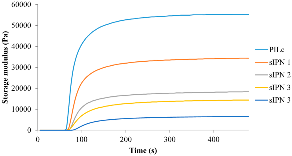 To determine the curing and mechanical properties of the hydrogels, samples of PILc, sIPN 1, sIPN 2, sIPN 3 and sIPN 4 hydrogels were synthesized in triplicate, according to the cocktail compositions given in Table 1. The storage modulus curves in Figure 6 show that each mixture features a sharp increase in the storage modulus value after being exposed to white light at t = 60 s. This is due to the rapid initiation and propagation of the photo-polymerization reaction. Following this, the storage modulus begins to plateau at approximately the same time for every monomer mixture used, indicating that the storage modulus reached ~95% of its maximum value after ca. 120 s exposure to white-light.