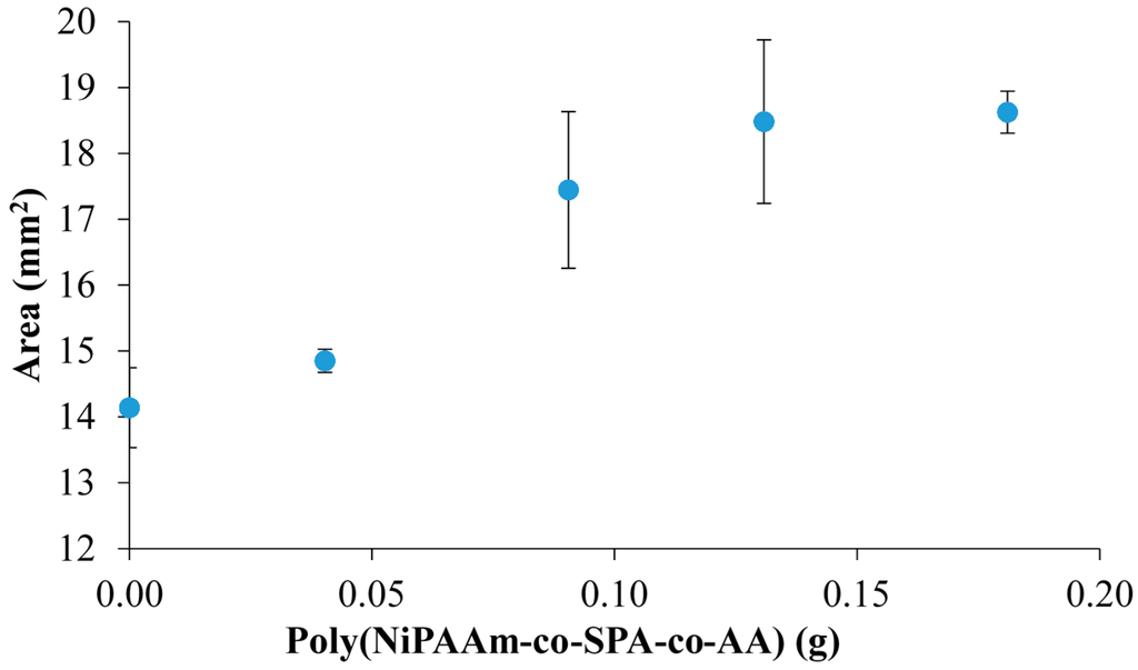 The effect of increasing the mass of linear p(NiPAAm-BSP-AA) copolymer on the fully hydrated hydrogel area (error bars are standard deviations for n = 3 replicate measurements).