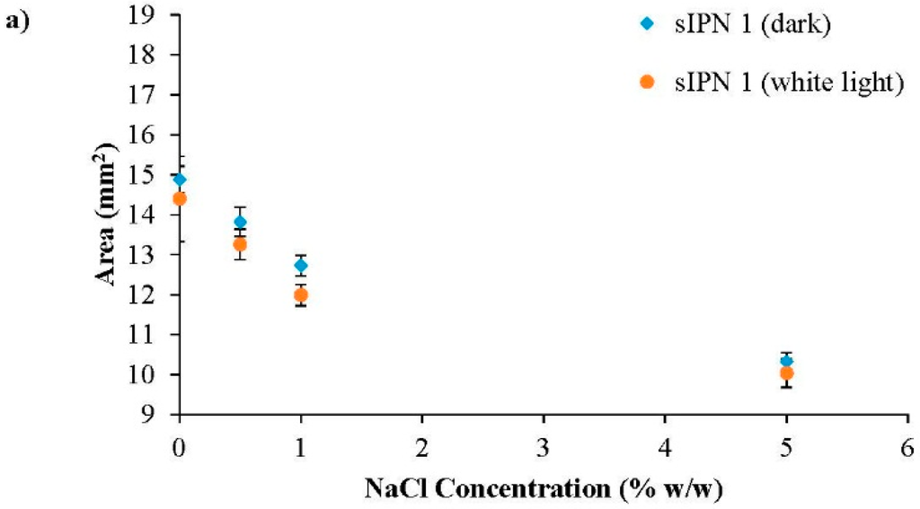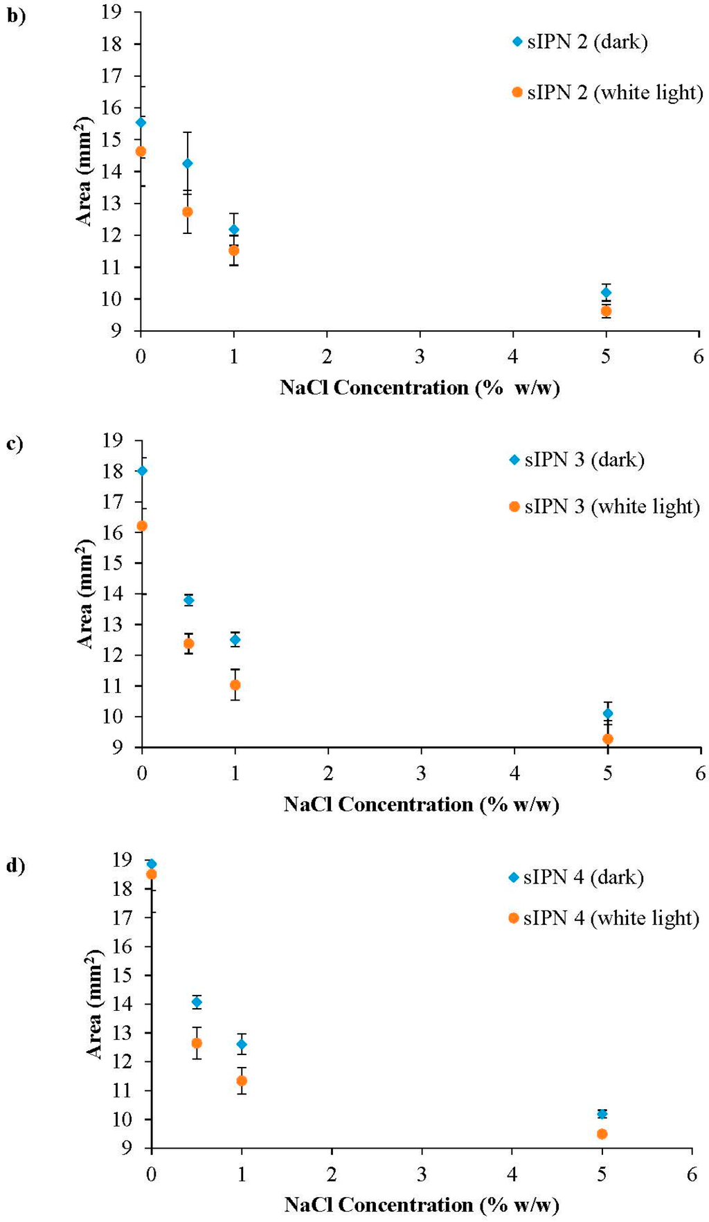 The inclusion of the white-light sensitive linear copolymer, p(NiPAAm-BSP-AA), in the sIPN matrix makes it possible to use the Mc-H+->SP photo-induced conformation change to influence the degree of swelling of the hydrogel [,]. The photo-induced shrinking of the different sIPN hydrogels was tested in different hydration media: DI water, 0.5% w/w NaCl, 1% w/w NaCl and 5% w/w NaCl, respectively. The effect of salt solutions on NiPAAm-based hydrogels has already been studied, and it was found that at 25 °C and at salt concentrations higher than 4% w/w NaCl, the dissolved linear pNiPAAm polymer precipitates out of solution []. This is due to the Na+ and Cl− ions competing for water with the linear p(NiPAAm), enhancing the tendency of p(NiPAAm) to form polymer-polymer interactions and to more readily precipitate as the globular form. This is the same phenomenon that appears when salting-out proteins from a solution [,]. A similar effect of the salt concentration is expected with the p(NiPAAm-BSP-AA) chains when the sIPN is hydrated in aqueous salt solutions. In Figure 8a–d, the area of sIPN 1, sIPN 2, sIPN 3 and sIPN 4 is plotted against salt concentration. For each hydrogel two area values were plotted for every salt concentration, representing the hydrogel’s area before and after being irradiated with white light for 30 min at ~200 kLux. The largest area decreases occur with sIPN 2 and sIPN 3 when immersed 0.5% w/w NaCl solutions. For sIPN 2 the decrease in area is 10.77% ± 5.24% (n = 3), while for sIPN 3 the decrease is 10.26% ± 2.59% (n = 3). The results indicate that for each hydrogel, the white-light induced shrinking remains roughly constant until the salt concentration exceeds 1% w/w NaCl. At higher salt concentrations, the hydrogels primarily shrink in size due to the interactions that start taking place between the dissolved salt ions and the charged polymer chains, while the white light irradiation shows reduced influence. This shrinking behaviour is known as the polyelectrolyte effect [,]. For each hydrogel composition, the shrinking profile is very similar as the salt concentration is increased (13.95 ± 0.21 mm² in 0.5% w/w NaCl, 12.56 ± 0.23 mm² in 1% w/w NaCl and 10.00 ± 0.09 mm² in 5% NaCl, respectively) (Figure 9).