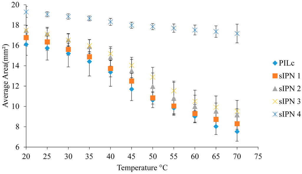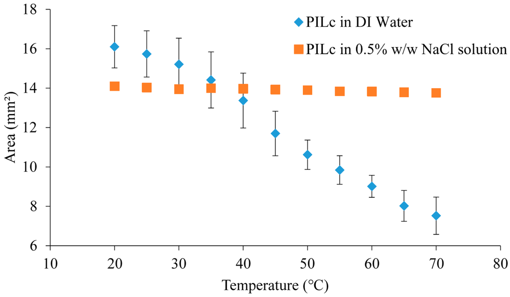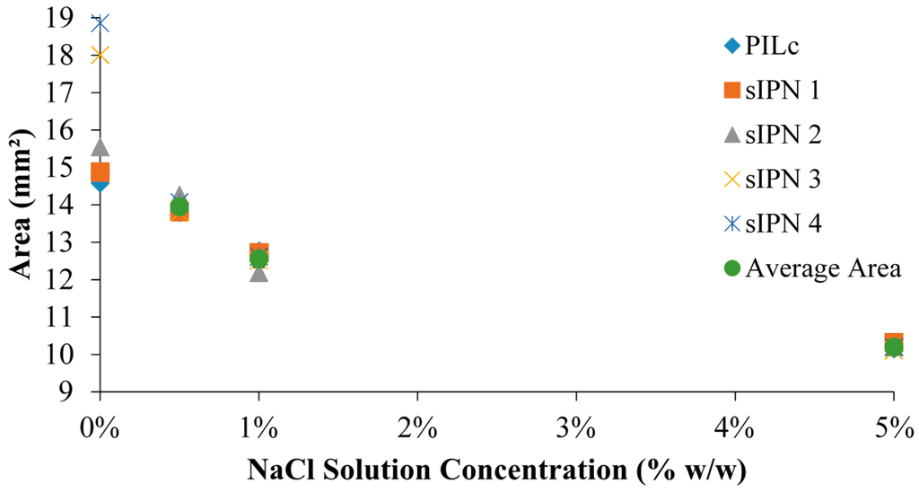As described in the Experimental Section, the hydrogels were initially allowed to swell in DI water. For each measurement, three different hydrogels were used, to ensure that the process is reproducible. In Figure 11, the area difference at each temperature step is plotted against temperature to determine the influence of the linear p(NiPAAm-BSP-AA) copolymer on the temperature induced shrinking properties of the sIPN hydrogels. Using Equation (1), the area difference between the hydrogels at 20 °C and 70 °C was calculated (Table 5). PILc showed the highest degree of area shrinking at ~53.3% of its fully hydrated size, followed by sIPN 1, sIPN 2, and sIPN 3, with ~50.6%, ~47.6%, and ~45.5% area shrinking, respectively. These results indicate that the addition of the linear p(NiPAAm-BSP-AA) copolymer doesn’t significantly influence the thermally induced shrinking capabilities of the PIL matrix up to a linear copolymer:PILc molar ratio of 3:1. With sIPN 4 however, the shrinkage effect is much reduced at ~11%, suggesting that above a certain concentration of the copolymer, the linear chains inside the PILC matrix inhibit the collapse of the matrix. The effect of salt in the hydrating medium on the temperature response of the hydrogels was also investigated. In Figure 12, the temperature response of the PILc in the presence of 0.5% w/w NaCl was completely prevented. This result is consistent with a previous study done by Men et al. which showed that the LCST of different linear poly(ionic liquid)s is influenced by the presence of competing ions in the hydrating solution, to the point that the LCST completely disappears if the competing salt has a chaotropic behaviour []. In our experiments a 0.5% w/w NaCl concentration was enough to stabilize the PSPA chains in such a way that they did not collapse at any temperature. Furthermore, the 0.5% w/w NaCl solution had a similar effect with all the sIPNs, completely suppressing the temperature induced swelling in every case.