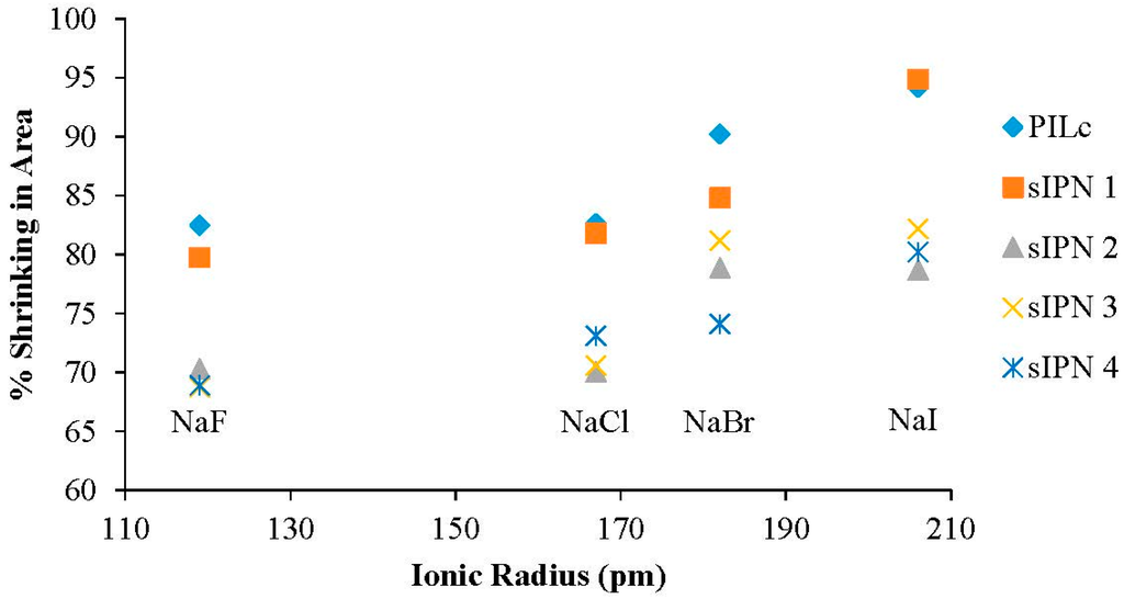 To better understand the effect of dissolved ions in the hydrating solution on the hydration properties of the hydrogels, a series of 1% w/w solutions were made using NaF, NaCl, NaBr and NaI, respectively. In Figure 10, the area of each hydrogel was plotted against the ionic radius of the anions present in the hydrating solutions. The shrinking% was calculated, using Equation (1), taking into account that the fully hydrated area was considered the area of the hydrogels swollen in DI water. By plotting the shrinking effect against the ionic radius of the anions, the influence of volume charge density can be explained. Volume charge density is a measure of electric charge per unit of volume. The results indicate that F− induces the maximum area shrinking for every hydrogel, while I− has the least influence (Table 4). The reason behind this shrinking effect is two-fold: the dissolved salts have a shrinking effect on the PIL matrix due to the polyelectrolyte effect [], while also having the same effect on the linear p(NiPAAm-BSP-AA) chains [,,]. The shrinking effect occurs because of an electrostatic screening that appears between the charged PIL chains and the ions present in the solution that affects the way water is distributed around the polymer chains and salt ions, thus directly contributing to the water intake of the hydrogels []. The fluoride anion has the highest volume charge density and therefore has the strongest screening effect, making the hydrogels shrink the most. In contrast, iodide has the lowest volume charge density, making the hydrogels shrink the least.