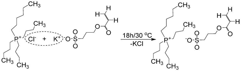 The synthesis of tributylhexyl phosphonium 3-sulfopropyl acrylate (PSPA) was carried out by dissolving P4446Cl (5 g) and KSPA (4.628 g, 1.3 molar equivalents) in deionized water (25 mL), followed by stirring at 30 °C for 18 h (Scheme 1). The reaction product was extracted three times with dichloromethane (DCM, 25 mL). The resulting organic phase was washed with deionized water to extract any unreacted products. Following this final separation, anhydrous MgSO4 was added and the resulting solution was filtrated. The PSPA organic solution was concentrated using a rotary evaporator, followed by extracting the final solvent traces using a high vacuum pump (0.5 mBar). The yield of the synthesis and purification method was around ~65%. PSPA—1H-NMR, δH (400 MHz, CDCl3): 0.84–0.95 (m, 12H, CH3), 1.26–1.29 (m, 4H, CH2), 1.47–1.50 (m, 16H, CH2), 2.14–2.32 (m, 10H, CH2), 2.84–2.87 (t, 2H, CH2), 4.22–4.25 (t, 2H, CH2), 5.74–5.77 (dd, 1H, CH), 6.01–6.08 (m, 1H, CH), 6.31–6.36 (dd, 1H, CH) ppm.