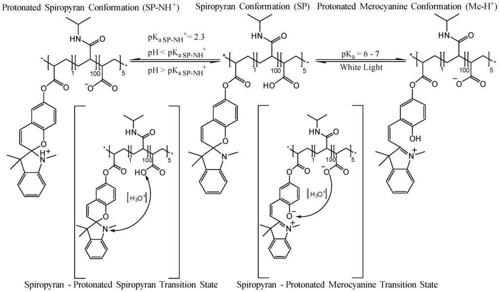 Ziołkowski et al. recently described the synthesis and characterization of a photo/thermo-responsive hydrogel material consisting of NiPAAm-co-spiropyran-co-acrylic acid (p(NiPAAm-BSP-AA)) copolymer []. The additional photo-response is conferred by the presence of the spiropyran photochromic monomer that reversibly changes its conformation from a hydrophilic protonated merocyanine form (Mc-H+) to a hydrophobic spiropyran form (SP) under different illumination conditions. When immersed in DI water, the acrylic acid comonomer dissociates and the spiropyran is protonated to form the Mc-H+ form. In this conformation, the molecule is more hydrophilic compared to the closed SP form, triggering hydrogel expansion. Upon white light irradiation, the reverse process happens, and the Mc-H+ is converted back to the closed SP form. Thus, based on this photo-induced transition of the polymer from a more hydrophilic to a more hydrophobic conformation, water is expelled from the hydrogel matrix. This effect caused some of the hydrogels to shrink by ~49%, compared to their maximum shrinking capability, after a 20 min exposure to white-light. The gels subsequently revert back to ~97% of their original size after 1 h in the dark.