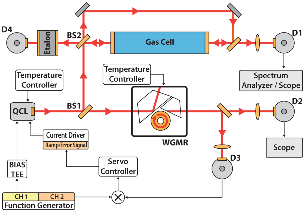 The laser was operated at about 780 mA, with total emitted power slightly higher than 10 mW. As shown in Figure 1, the laser beam is split into two arms by a 50:50 beam splitter (BS1). The transmitted light is coupled to a OEwaves CaF toroidal WGMR (3.6 mm diameter). This resonator has a free-spectral range (FSR) of 18.9 GHz at the operating wavelength. It is mounted inside a custom-made housing to reduce both mechanical and thermal fluctuations and to protect it from dust and humidity. To allow free-beam evanescent-wave coupling, a sapphire prism is placed close to the resonator surface. The prism–WGMR gap depends on the temperature at which all the system is maintained. The transmission from the resonator is used for electronic locking by means of a thermoelectrically-cooled fast HgCdTe photodiode (Vigo PVI-4TE-5, ∼10 MHz bandwidth). This signal from the photodiode is processed by the locking electronics (frequency mixer and servo controller) and added to the laser current via the driver modulation input as a correction signal, as described in [15]. A liquid-N-cooled InSb photodiode (Hamamatsu P5968-100, D2 in the figure) is also used for monitoring the transmitted signal in both unlocked and locked conditions.