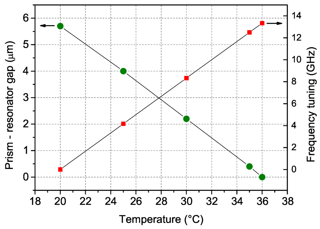 As mentioned above, tuning the temperature of the resonator has a twofold effect. On one hand, it modifies the coupling prism–WGMR gap and, as a consequence, the amount of light coupled into the resonator: This translates into a change of the WGMR finesse (Q-factor) and of the mode width. On the other hand, it also changes the resonator dimensions and refractive index, allowing for fine frequency tuning of the transmission mode. The measured tuning coefficient with temperature is about 0.85 GHz/K. This behavior is reported in Figure 2.
