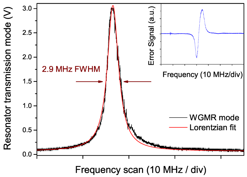 In the figure, a Lorentzian profile is fitted to the recorded mode, showing a good agreement. The slight distortion visible at one side (right in the figure) reflects thermal effects occurring during a frequency scan of a high-Q resonator mode. The mode width is about 2.9 MHz (FWHM), corresponding to a Q-factor of 2.3 × (finesse 6300).