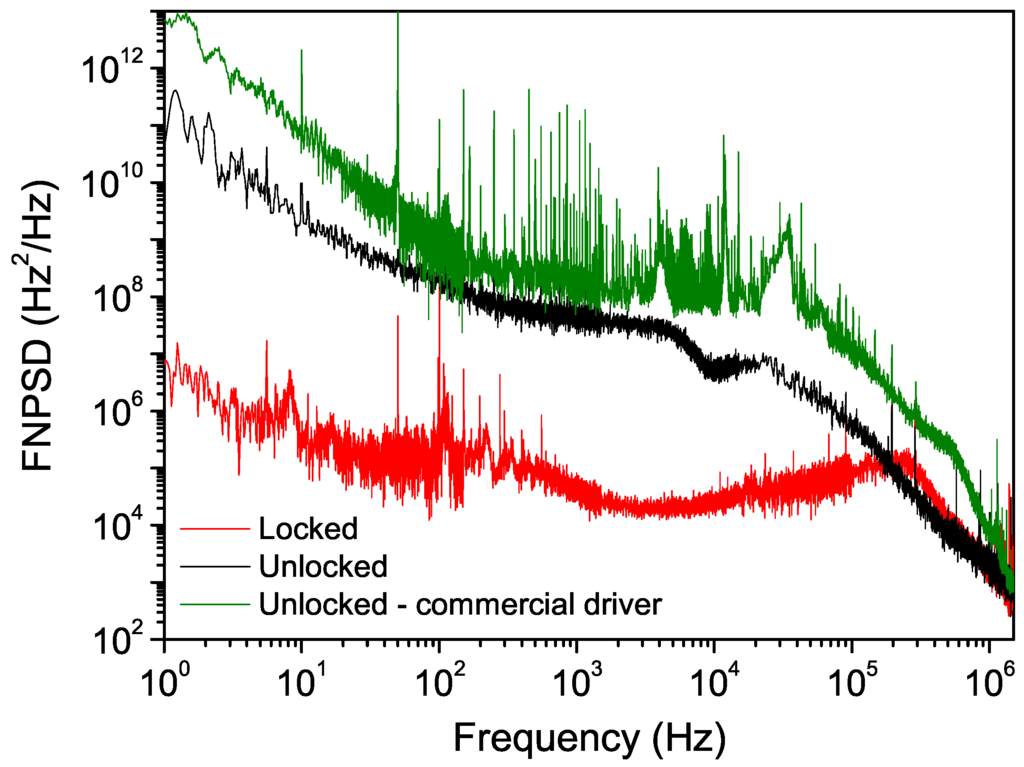 Frequency noise spectral power density of the laser in both free-running and locking conditions (black and red traces). The FNPSD with the laser operated with a commercial driver is also shown for comparison (green trace).