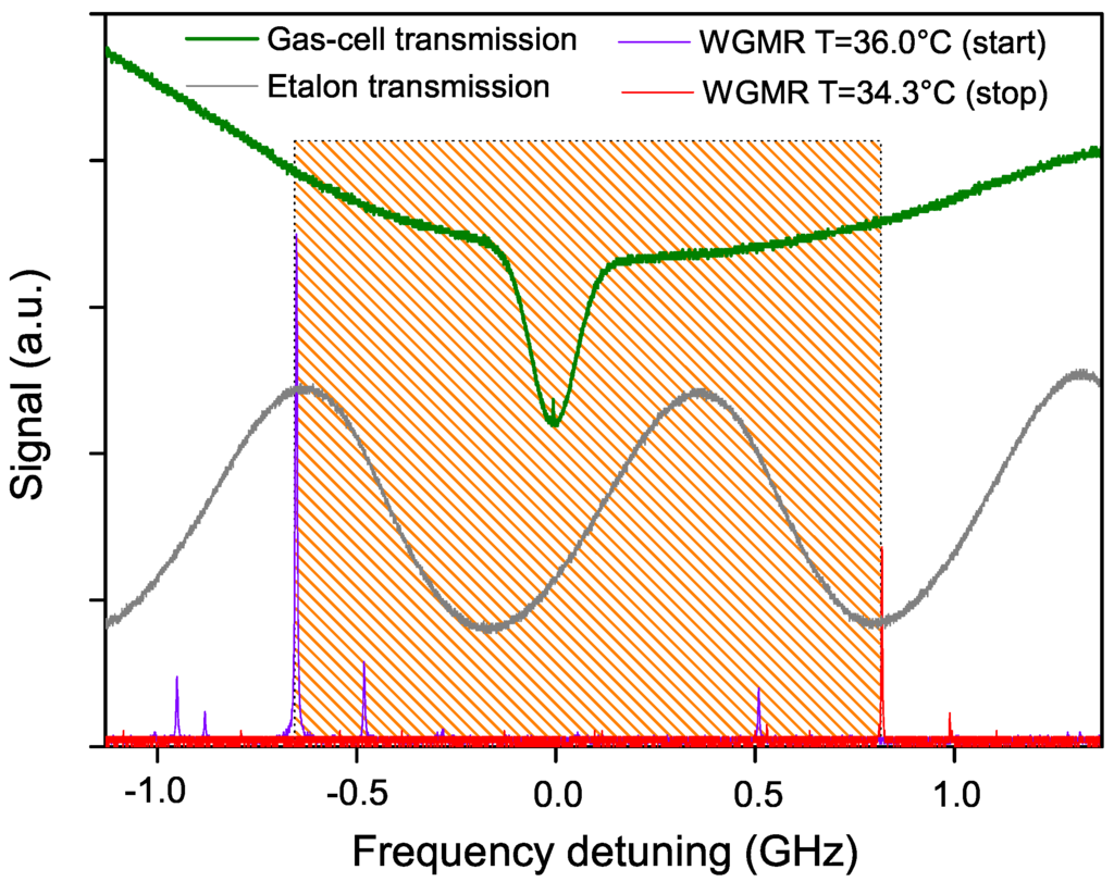 When the stabilization loop is closed, a fine tuning of the WGMR resonance up to about 1.5 GHz can be achieved without losing the locking condition, by acting only on its temperature. It is worth noting that, in this proof-of-principle demonstration, no additional current or temperature feed-forward was sent to the laser. In Figure 6, the green trace shows the absorption profile after the cell (CO pressure about 0.1 mbar). The effect of the absorption from the ambient CO is evident (broad parabolic-like shape in the green trace). The Doppler-broadened absorption due to the low-pressure CO in the cell emerges from the background and the Lamb dip can be distinguished at its center. The continuous tuning range achieved in the locking condition is represented in the figure by the hatched region. The WGMR transmission modes recorded at the initial and final temperatures are shown in violet and red, respectively. The gray sinusoidal-like trace is the etalon transmission (1 GHz FSR).