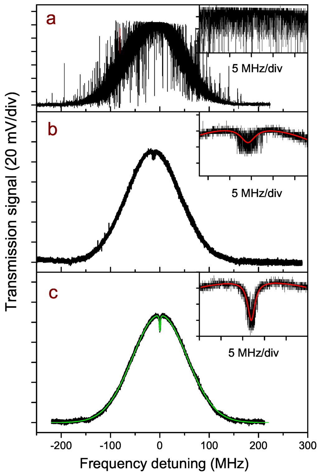 Optical transmission signal through the spectroscopic cell with the laser scanning of the CO transition. The three cases corresponding to the different traces are: free-running laser operated with the commercial driver (a); laser operated with the home-made driver in free-running (b) and locking (c) conditions. All three graphs have the same horizontal scale, representing the detuning from the center frequency of the transition. In each inset, a zoom of the top line profile is shown, over the same horizontal and vertical scales, with the red curves showing the Lorentzian fit of the dip (b,c). The thin green trace superimposed on the data in (c) is a simulation of the sub-Doppler feature based on the HITRAN data, as described in the text.