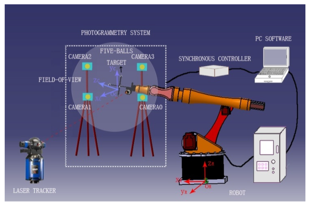 Industrial robots have the characteristics of high repeatability positioning accuracy and low absolute positioning accuracy. This is due to the structure of the robot, manufacturing errors, kinematic parameter error and environmental influence [10]. To improve the absolute positioning accuracy of the robot, the use of an external sensor to measure the position of the robot manipulator it any effective approach. This paper proposes an on-line calibration system for the kinematic parameters of the robot using a laser tracker and a close-range photogrammetric system, as Figure 1 shows. According to the differential equations constructed by the kinematic parameters of each robot axis, the final mathematic model of kinematic parameters of the robot is established. The position errors of the robot manipulator are obtained by comparing the coordinates in the robot base coordinate system and the measurement sensor system. Then, the errors, including the coordinate transformation error, target installation error and position and angle errors of the robot kinematic parameters, are separately corrected. In the robot calibration, on the one hand, the coordinate transformation error directly affects the final error correction of the kinematic parameters. On the other hand, the coordinate systems of sensors are often required to transform in the on-line combined measurement system. Therefore, the premise of obtaining the position errors of a robot manipulator is to unify the coordinate systems of the various measurement sensors by an accurate, fast and stable coordinate transformation algorithm.