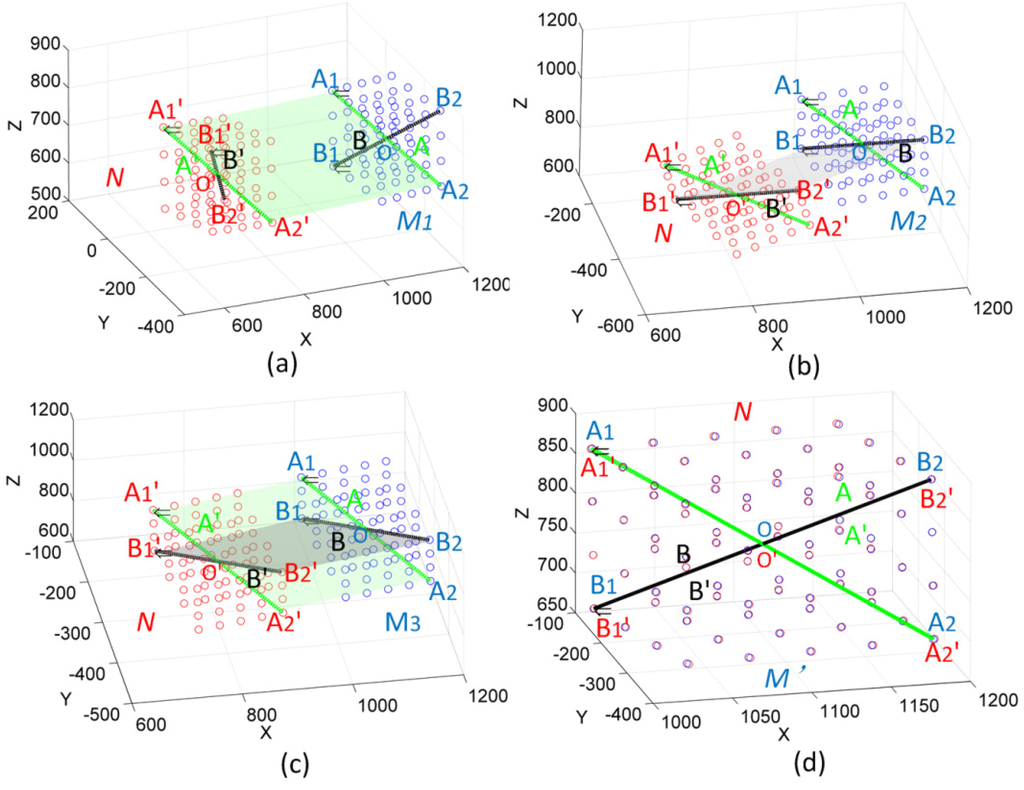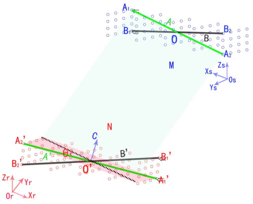 Then, the characteristic line A of the new point cloud M1 is parallel with the characteristic line A' of point cloud N, as Figure 4a shows.