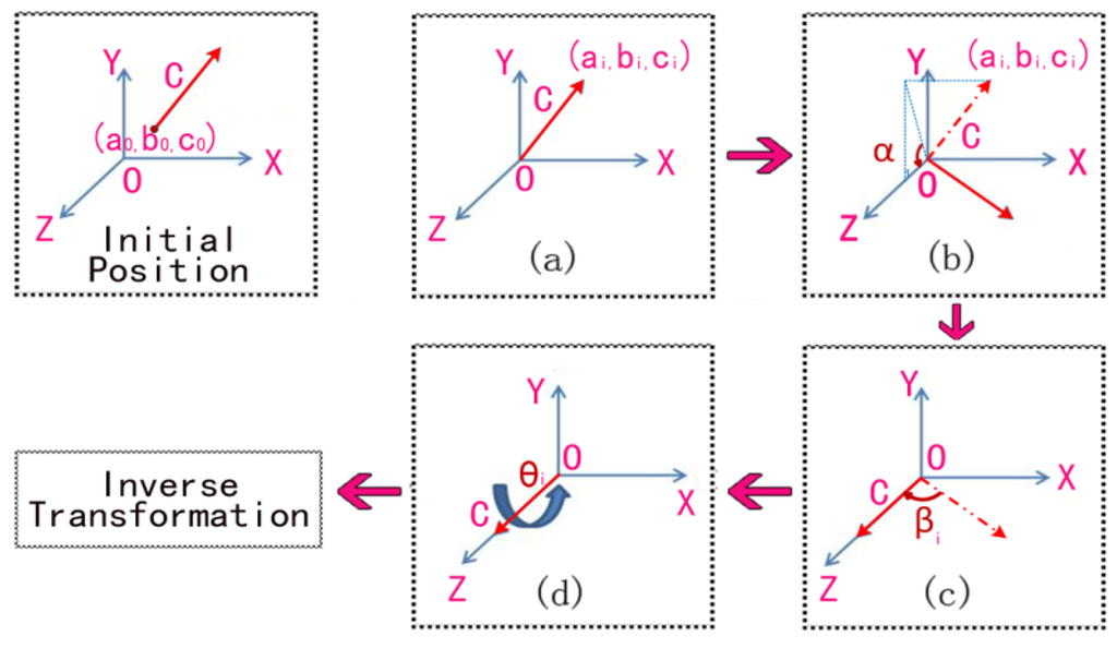 - Rotate the axis degrees around Axis Z, as shown in Figure 3d.where is the angle between lines A and A', which can be obtained by .