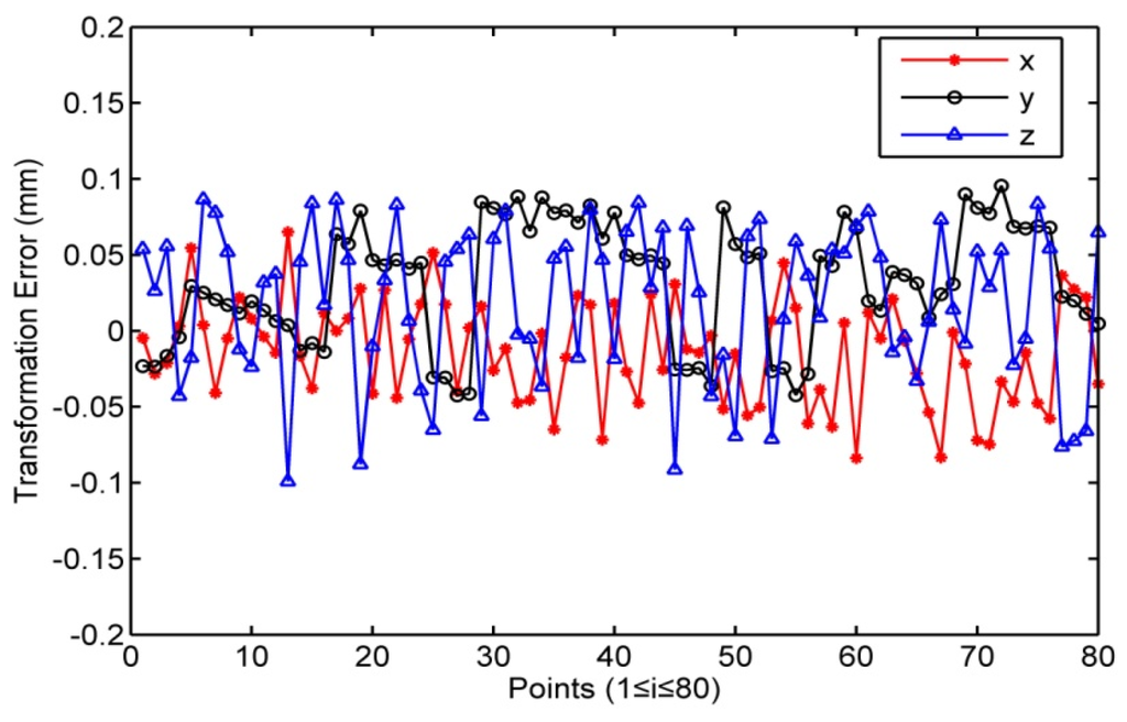 It is can be calculated from Table 2 that the average values of the transformation error between the coordinate systems of the robot and photogrammetric system are = 0.106 mm, = −0.062 mm and = 0.013 mm. The average values of the transformation error between the coordinate systems of the robot and laser tracker are = −0.015 mm, = 0.041 mm and =0.023 mm. Figure 5 and Figure 6 show that the transformation error of the photogrammetric system is approximately 10 times greater than that of the laser tracker. As in the earlier presentation, the nominal measurement accuracy of the photogrammetric system is 10−2 mm and that of the laser tracker is 10−3 mm. The results illustrate that the transformation accuracy has the same order of magnitude as that of the measurement sensor. This indicates that the transformation error is so small that it would not influence the accuracy of the sensors. The transformation method can also make the error distribution of the low precision sensor more uniform to improve the transformation accuracy and the accuracy of the robot calibration.