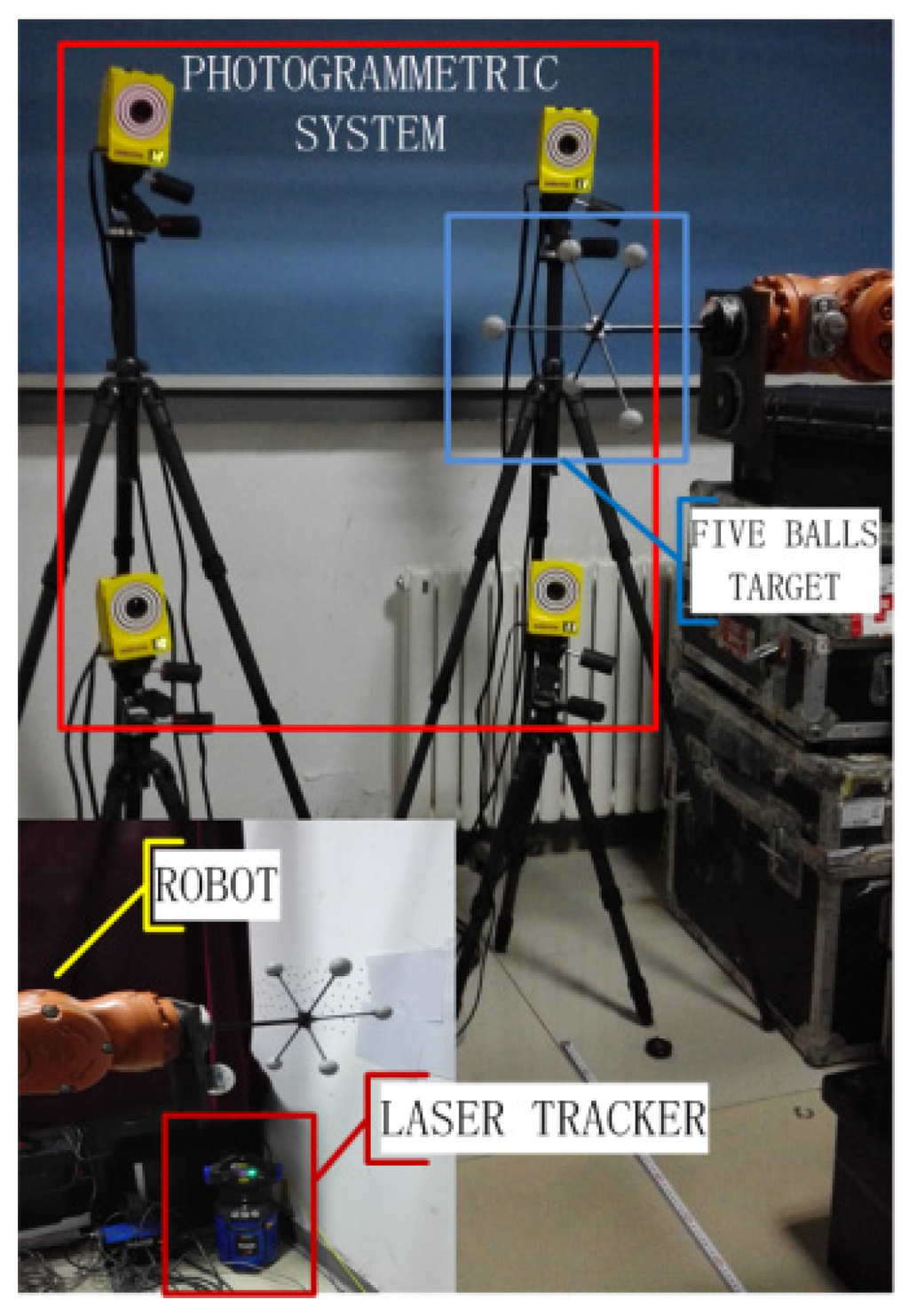 The on-line robot calibration system we constructed includes an industrial robot, a photographic system and a laser tracker as shown in Figure 4. The model of the robot in lab is the KR 5 arc from KUKA Co. Ltd. (Augsburg, Germany), one of the world's top robotic companies. Its arm length is 1.4 m and the working envelope is 8.4 m3. For covering most of the robot working range, the close range photogrammetric system in the lab, TENYOUN 3DMoCap-GC130 (Beijing, China), requires a field of view of more than 1 m× 1 m× 1 m without any dead angle. To achieve the goal of on-line measurement, a multi-camera system is needed. We used a multi-camera system symmetrically formed by four CMOS cameras with fixed focal lengths of 6 mm. The laser tracker in the lab, FARO Xi from FARO Co, Ltd. (Lake Mary, FL, USA) is a well-known high accuracy instrument whose absolute distance measurement (ADM) is 10 μm ± 1.1 μm/mL. The laser beam can easily be lost in tracking because of barriers or the acceleration of the target, which would cause minor errors. Therefore, we combine the laser tracker with the photographic system to improve the measurement accuracy and stability and thereby make full use of the advantages of the high accuracy of the laser tracker and the free light-of-sight of the photographic system. After proper data fusion, the two types of data from the photographic system and the laser tracker can be gathered together. The method of data fusion and the verified experimental result are detailed in reference [21]. In the experiment, 80 points in the public field of the robot and the photogrammetric system are picked to build a cube of 200 mm × 200 mm × 200 mm. The reason for building a cube is to facilitate the selection of characteristic lines and the calculation of coincidence parameters. The two targets of the photogrammetric system and laser tracker are installed together with the end axis of the robot by a multi-faced fixture. To obtain accurate and stable data, the robot stops for 7 s at each location, and the sensors measure each point 20 times, providing an adequate measurement time for the photographic system and laser tracker. The experimental parameters of the photogrammetric system are an exposure time of 15 us, a frequency of 10 fps and a gain of 40, based on experience.