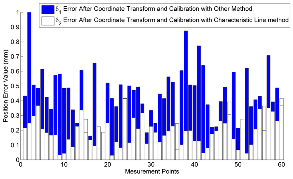 Experiments are designed to calibrate the kinematic parameters of the robot. The measurement system is shown in Figure 7. Sixty points in space are used for the calibration. After the coordinate transformation, the position errors between the sensor and the robot manipulator are obtained. A constraint method based on the minimum distance error is adopted to calibrate the robot kinematic parameters [20,21]. Twenty seven kinematic parameters, including 24 link parameters and three parameters of the fixture, are corrected. Then, 60 correct positions are calculated using the calibrated robot kinematic parameters. To evaluate the performance of the proposed method, we use a group of calibration results, which adopts a different coordinate transformation method and the same robot calibration algorithm, as a comparison. The position errors of the robot after the coordinate transformation and calibration are shown in Figure 8. δ1 is the position error after the coordinate transformation with the other method [19], and δ2 is the position error after the coordinate transformation with the proposed method (Characteristic Line method).