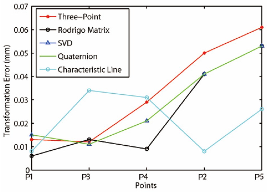 It can be indicated from Figure 5 that the average RMS using the other coordinate transformation method is mm. while the average RMS using the proposed method is mm. The position accuracy is improved by 45.8% using the Characteristic Line method.
