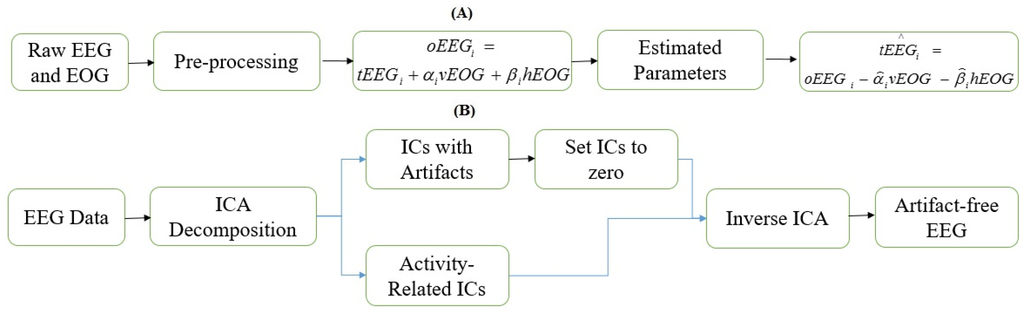 On the other hand, the second class of methods are based on the assumption that the neuronal activity and artifactual activity are independent from each other. Most commonly used method in blind source separation is independent component analysis (ICA) [,,]. In ICA based algorithms, EEG signal is decomposed into several independent components (ICs), which are then classified into neuronal-activity-related and artifactual ICs. The selected artifactual ICs are then removed to obtain artifact-free EEG. The main issue of this methodology is the selection of artifactual components, usually this can be done by the visual inspection of an expert but this approach might lead to misclassification of ICs and divergent results []. Recently, several automated criteria have been developed to tackle this issue [,,,] and they showed significant improvement in terms of artifact removal from EEG data but the distortion produced due the removal of those ICs in EEG signal was left unaddressed, since an artifactual IC may contain neuronal activity along with artifacts []. The schematic diagram illustrating the ICA based removal of ocular artifacts is shown in Figure 1B.