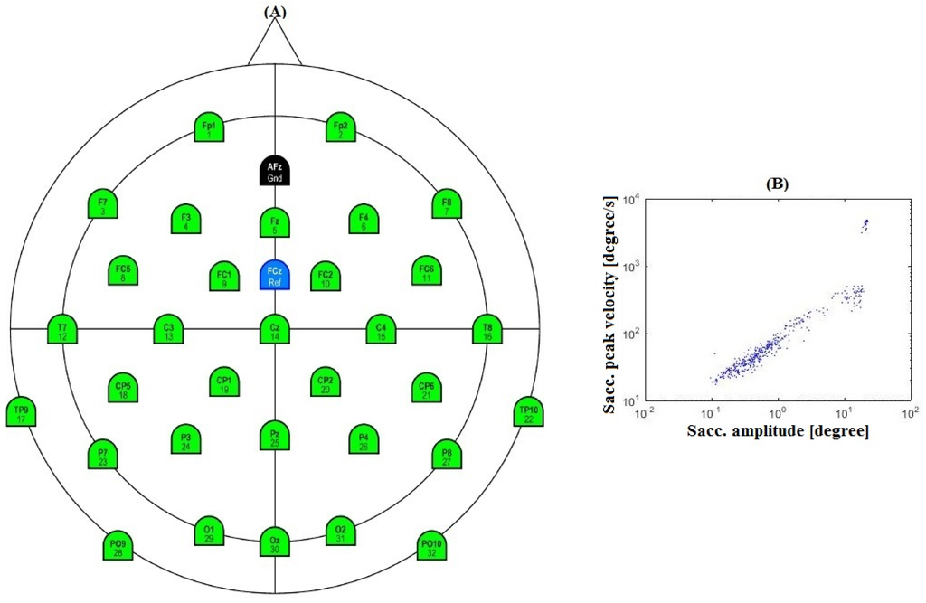 (A) Electroencephalogram (EEG) electrode configuration; (B) Distribution of saccade amplitude.