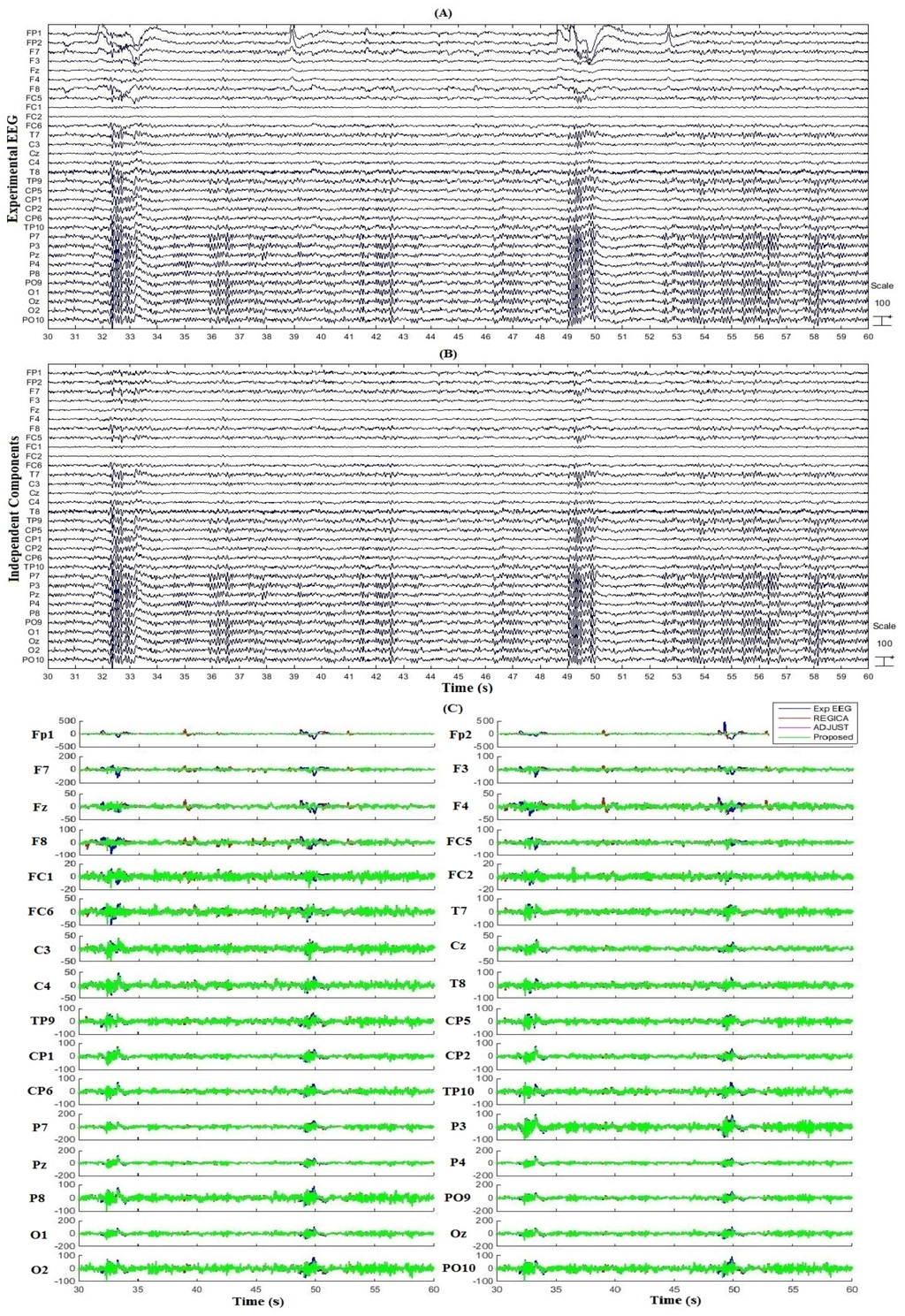 Results on experimental dataset. (A) Experimental EEG data for one subject; (B) Independent components (ICs) obtained from independent component analysis (ICA) decomposition of EEG data; (C) Comparison of the corrected EEG by the proposed algorithm and conventional algorithms.