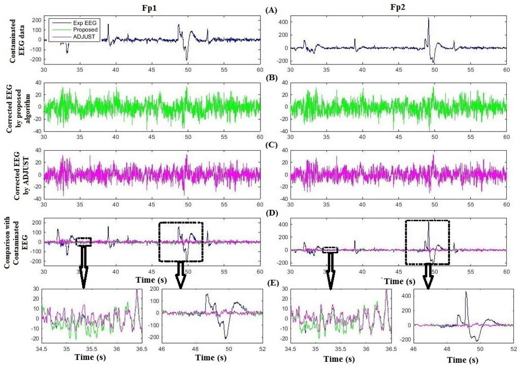 Finally, the proposed algorithm was tested on a standard EEG dataset to determine its utility for removal of ocular artifacts from EEG. Since the standard dataset does not contain EOG signals, so we only used this dataset to compare the proposed algorithm with ADJUST. Figure 10 compares the proposed method with ADJUST for artifact removal from standard EEG data at Fp1 and Fp2. Figure 10A shows the standard EEG data with the ocular contamination, Figure 10B,C, the artifact-free EEG after implementation of the proposed algorithm and ADJUST, respectively, and Figure 10D, a comparison of the proposed algorithm and ADJUST with contaminated standard EEG data. The black boxes in Figure 10D highlight the uncontaminated and contaminated EEG-signal regions, which are partially enlarged in Figure 10E. It can be visualized that the performance of the proposed algorithm in removing ocular artifacts and maintaining the neuronal-activity-related EEG signal intact is significantly better than ADJUST (Figure 10E).