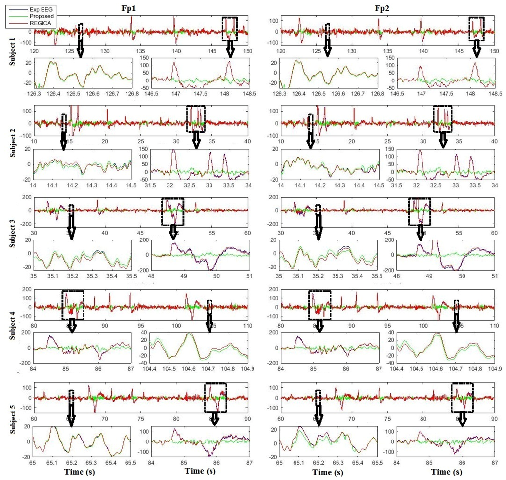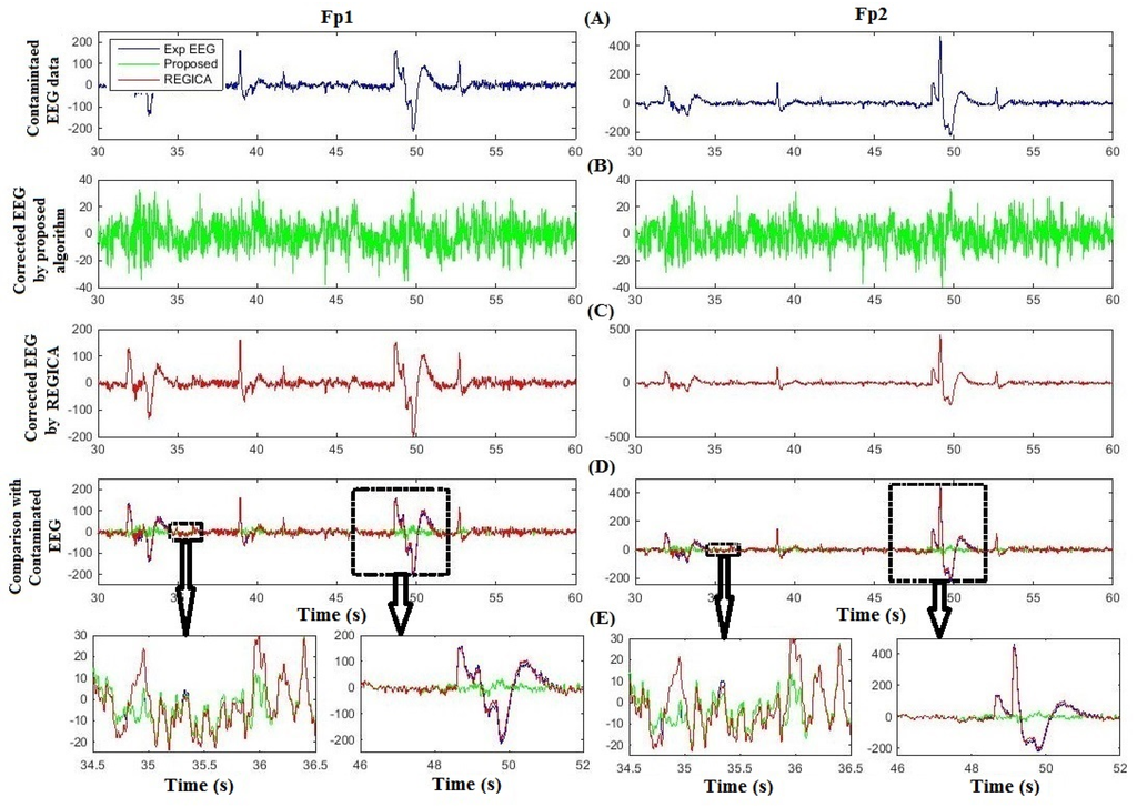 Figure 5 compares the proposed method and ADJUST for artifact removal for one subject at Fp1 and Fp2. Figure 5A shows the contaminated EEG data; Figure 5B,C are the corresponding artifact-free EEG after implementation of the proposed algorithm and ADJUST, respectively; Figure 5D compares the proposed algorithm and ADJUST with the contaminated EEG data. The two black boxes on the left and two on the right in Figure 5D highlight the uncontaminated and contaminated regions of the EEG signals at Fp1 and Fp2, respectively, which are partially enlarged in Figure 5E. Figure 5E shows that ADJUST causes distortion and loss of neuronal activity from the EEG data, whereas the proposed algorithm successfully preserves the neuronal-activity-related EEG signal intact. Indeed, in Figure 5E, it can be seen that the proposed algorithm performs better in removing ocular artifacts and reconstructing the EEG signal. Figure 6 illustrates the comparison of corrected EEG by proposed method with REGICA method. Figure 6D, meanwhile, compares the proposed algorithm with the REGICA at Fp1 and Fp2, respectively, and indicates that the proposed algorithm offers significantly better performance (Figure 6E).