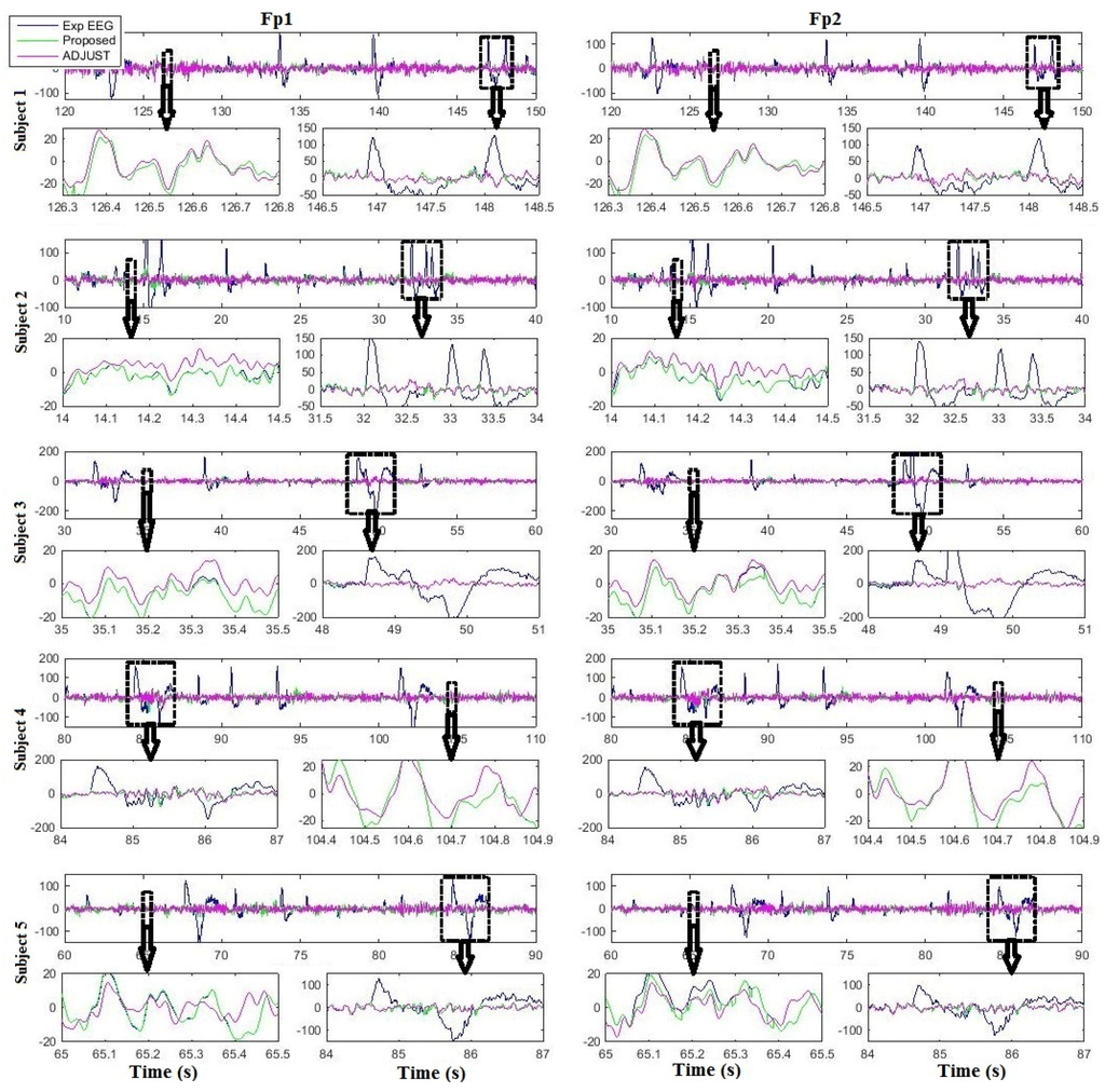 Comparison results of the proposed algorithm and ADJUST for all subjects at Fp1 and Fp2.