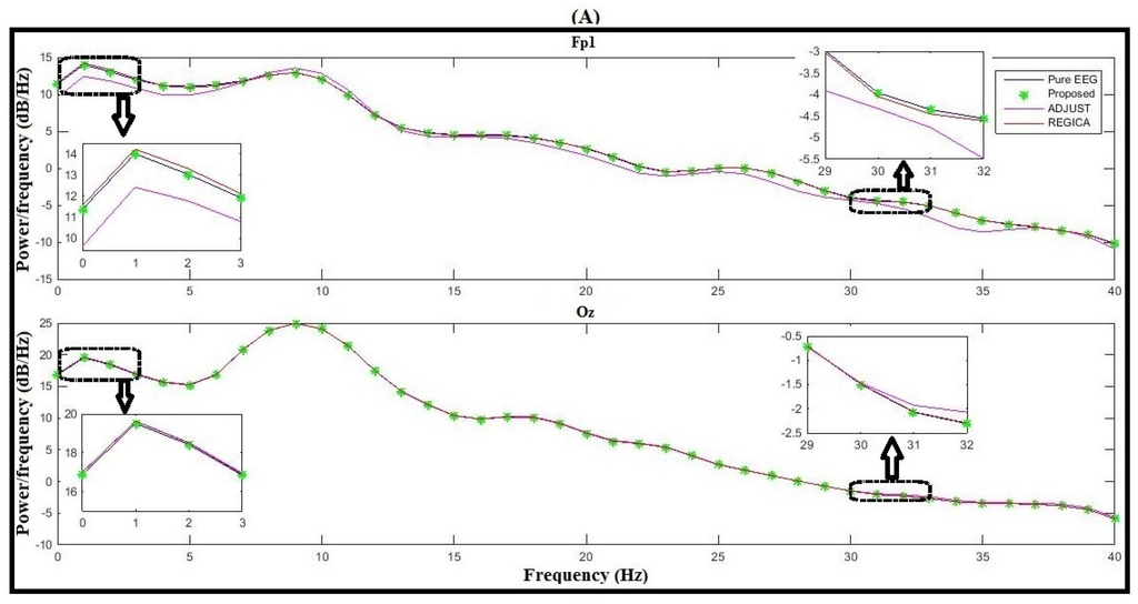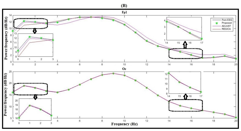 For this purpose, 10 s of artifact-free EEG data before artifact contamination is selected by an expert. Then, the PSD was computed using pwlech function in MATLAB. The resulting PSD of one subject on a frontal electrode Fp1 and a most occipital electrode Oz is shown in Figure 9. It can be seen in Figure 9A,B (upper panel) that the proposed algorithm outperforms the conventional methods (enlarged panels), whereas the PSD at Oz (bottom panel) for all the algorithms show good agreement with the PSD of the artifact-free EEG.