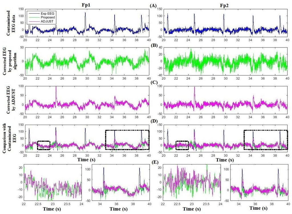 Comparison of the proposed algorithm with ADJUST using standard data. (A) Contaminated experimental EEG data at Fp1 and Fp2. (B) Corrected EEG by the proposed algorithm. (C) Corrected EEG by ADJUST. (D) Comparison of Corrected EEG with contaminated experimental EEG. (E) Partial enlargement of highlighted regions.