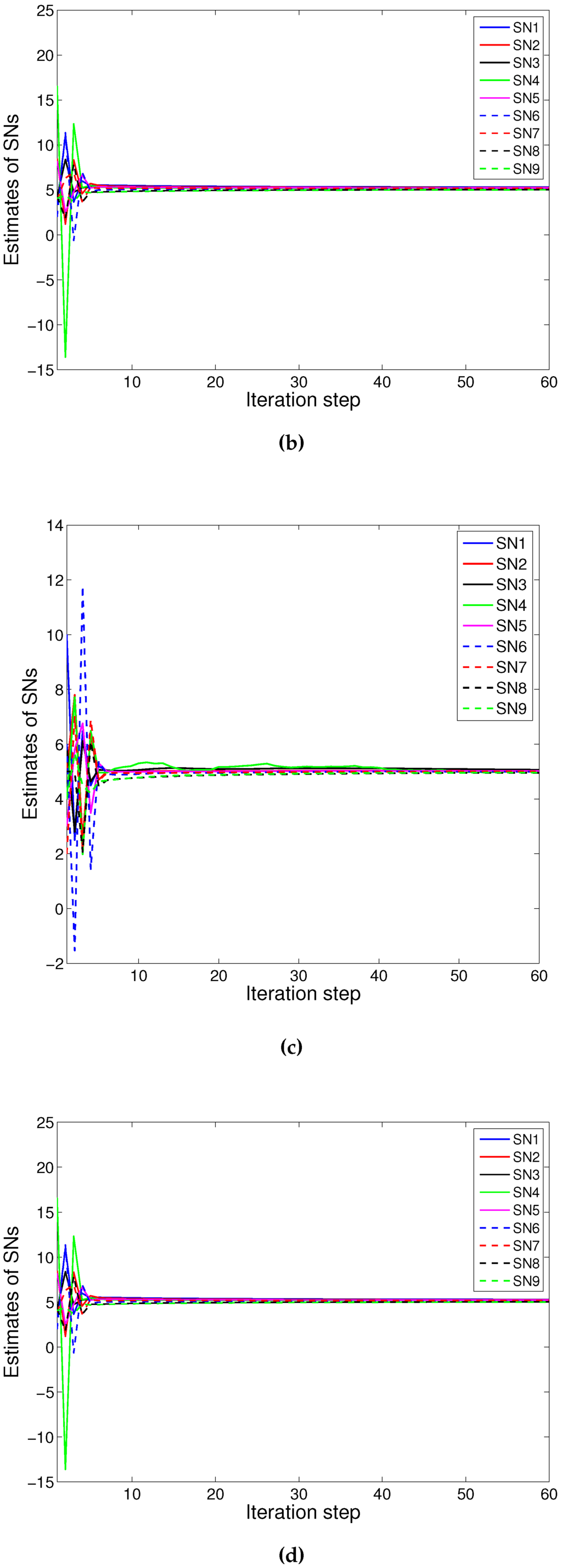With the consensus-based estimation, finally converges to a normal range, and keeps a common value when k is large enough. We assume keeps a common value for . Thus, we can get the result of the consensus.