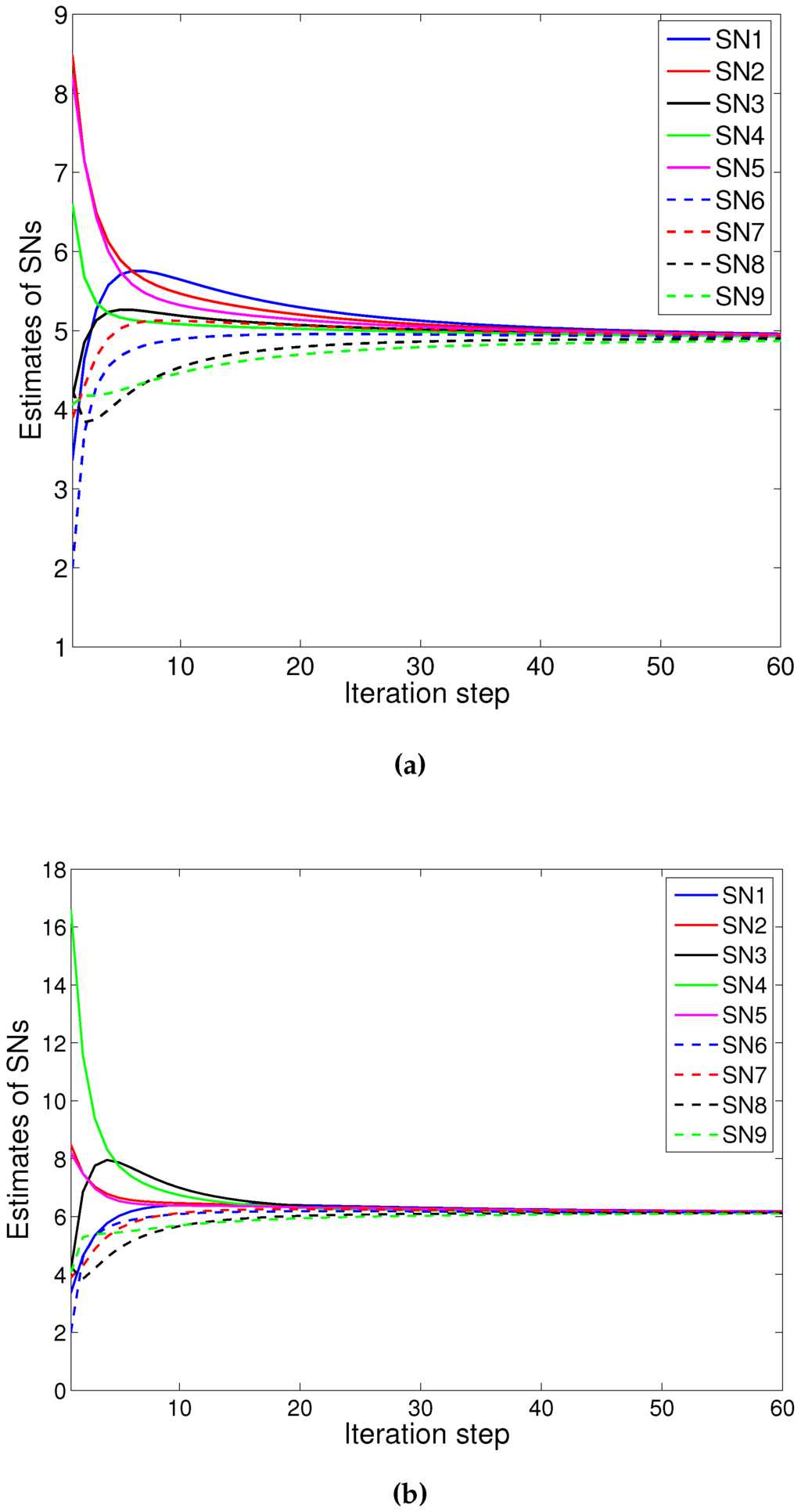 We consider more sensors as in Figure 4. Firstly, the results of PACS are demonstrated. Figure 5a shows the results of the PACS algorithm on the network without attackers. The consensus result is 4.7543. Additionally, the convergence is quick, although there are more sensor nodes in the network. Then, we consider the case that there are three attackers executing three different attacks: the SDF, ISF and RDF attack, respectively. Figure 5b demonstrates that the value of converges to 4.8561, and the difference between this value with the result without the attack is 0.1018 (i.e., the error is less than 2.14%). We can see that the scheme has a quite good resistance against the variety of data falsification attacks that exists in the network simultaneously.
