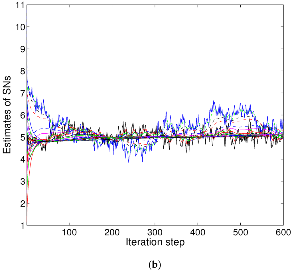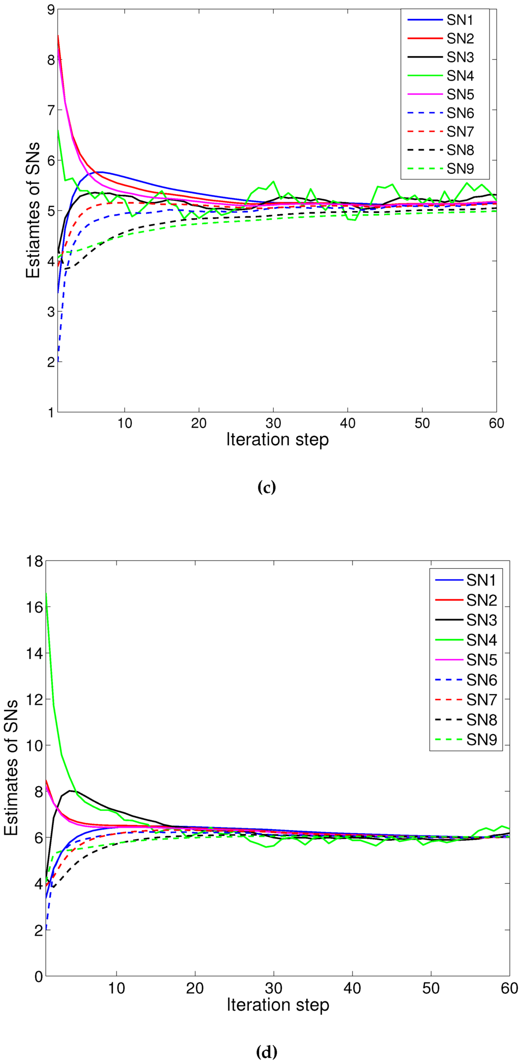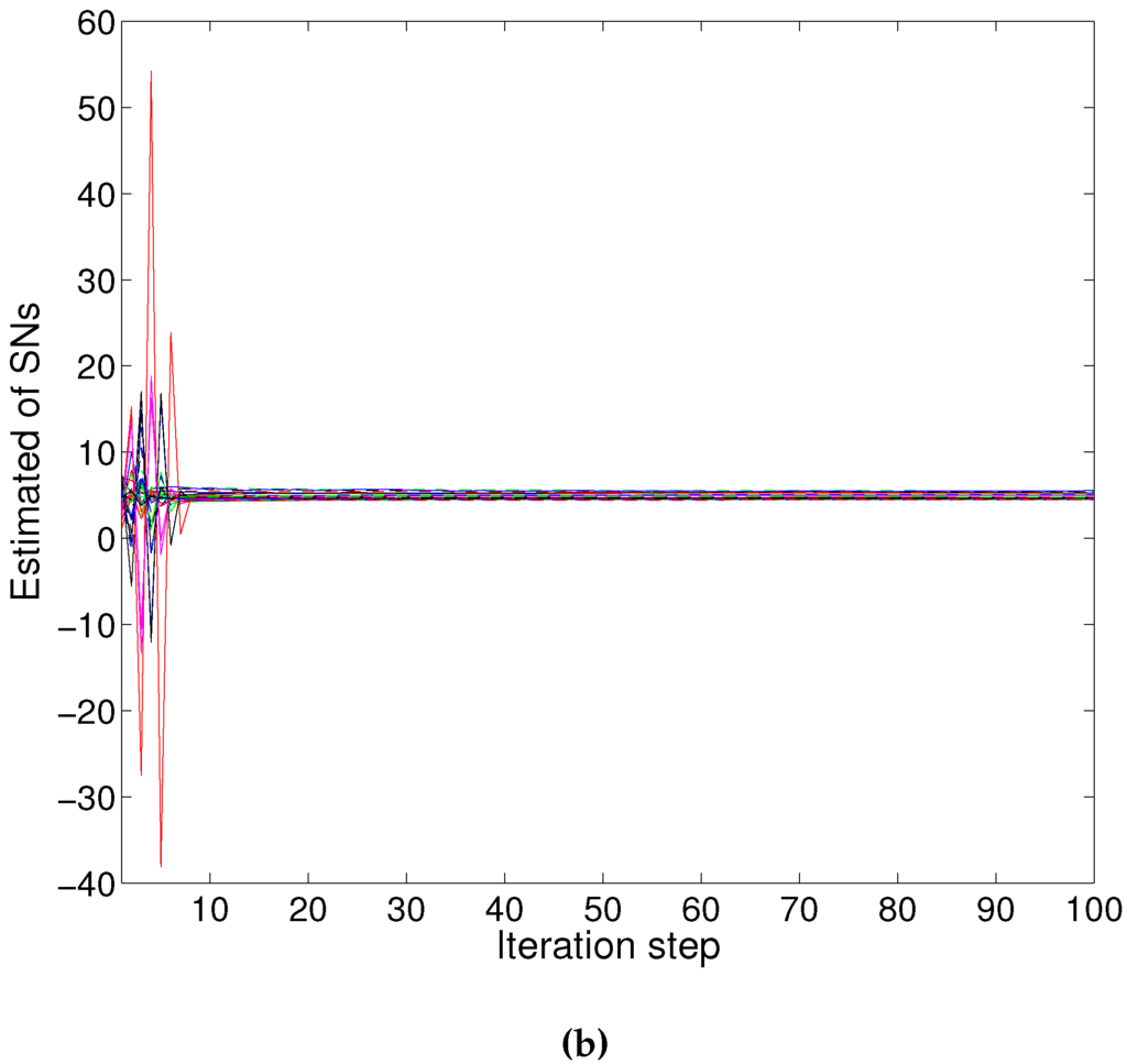 Throughout the numerical examples, the initial sensing value (i.e., ) is the average of 300 sensing reports for the band of 750–758 MHz. We set 10% as the initial link loss rate of each link, i.e., . Then, we use the off-line data analysis to validate the efficiency of the proposed scheme. Weights for RNs are set to be . The algorithm is implemented with the decreasing weight sequence , and , and .