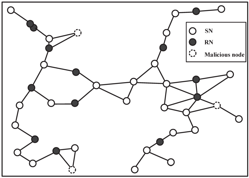 A network with 27 honest sensor nodes, 13 relay nodes and three attackers.