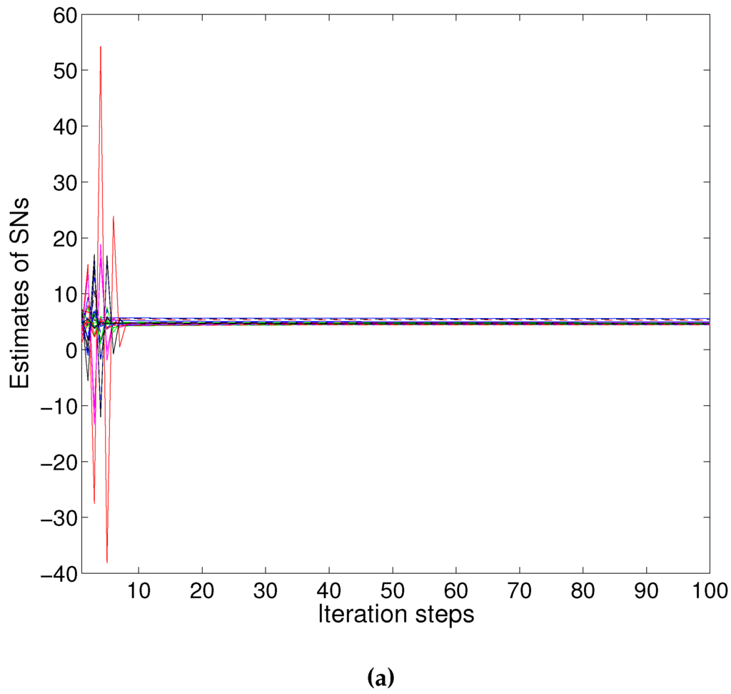 According to the proposed algorithm, if the state value is considered abnormal at each iteration k, the corresponding parameter of decreases. Additionally, is also changed. We suppose that the HWSN is not dominated by attackers.