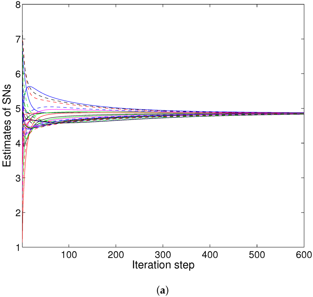represents the state value of node i at time step k. Δ represents the maximum degree of the network, and denotes the amplitude of the signal received by sensor i from sensor j. is the corresponding weight satisfying , and . We set the notation , for . For all , we have that . It is clear that each node updates its estimates by the linear combination of its neighbors’ state values and its own values.
