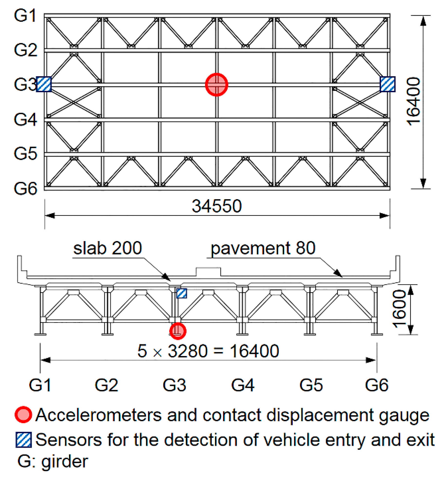 The experimental setup of the accelerometers and the contact displacement gauge (CDP-25, Tokyo Sokki) is shown in Figure 2. Each accelerometer was attached by screws to an L-shaped steel fixture that was fixed to the longitudinal center of the lower flange of the main girder (G3) with a C-clamp.