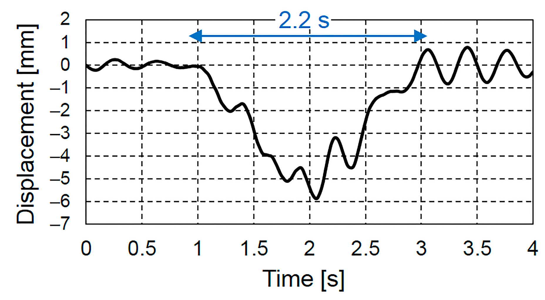 Figure 5 shows the displacement measured using the contact displacement gauge for a duration of 4 s at the longitudinal center of the lower flange of the main girder (G3) of the test bridge. Figure 5 shows the typical deflection due to the passage of a vehicle, and the vehicle passing time which depends on the span of the bridge and the vehicle speed, was approximately 2.2 s. Therefore, the frequency of the deflection due to the vehicle weight was approximately 0.5 Hz. In this case, as the length of bridge is 34.55 m, the speed of the vehicle was estimated to be 56.5 km/h.