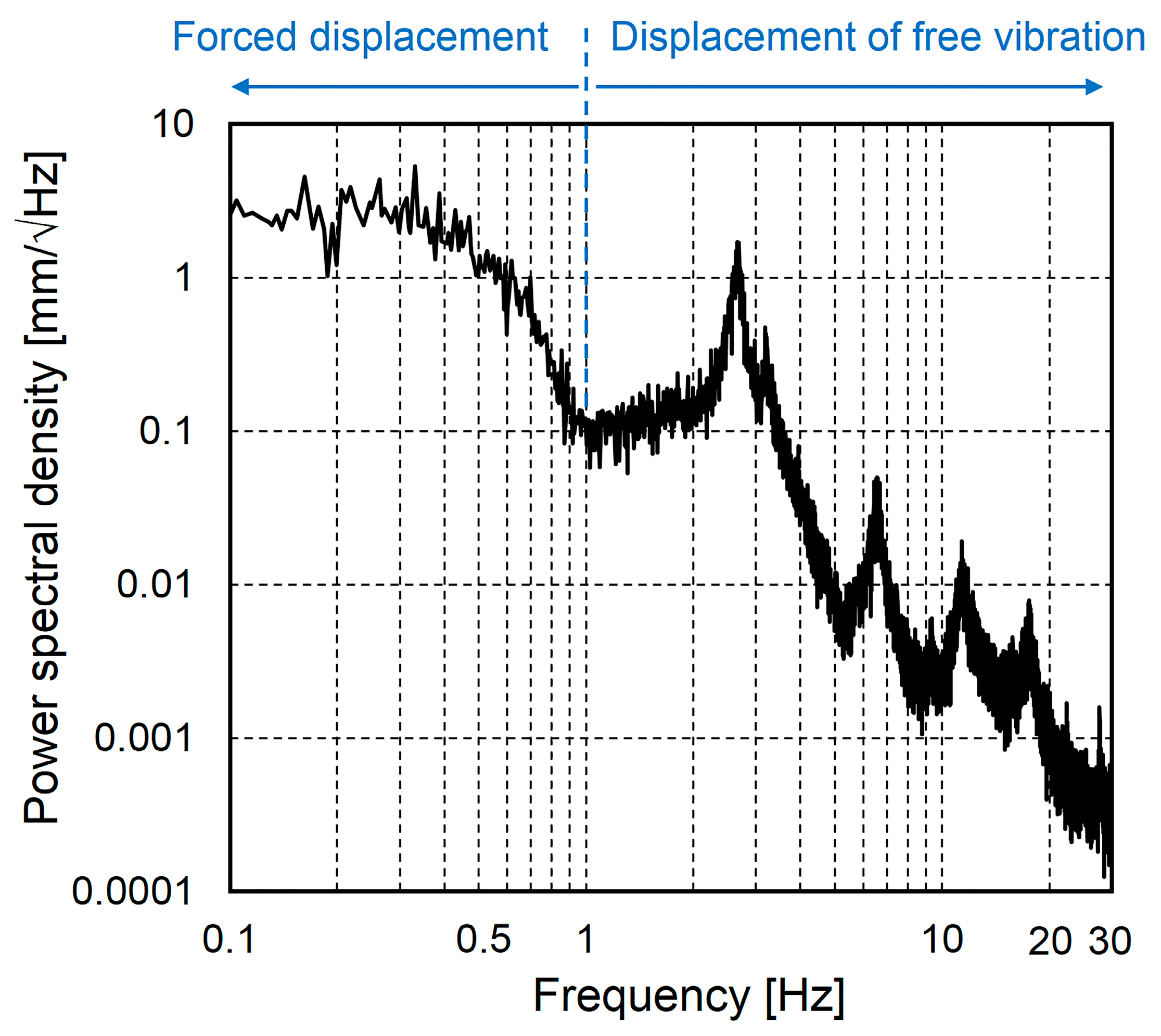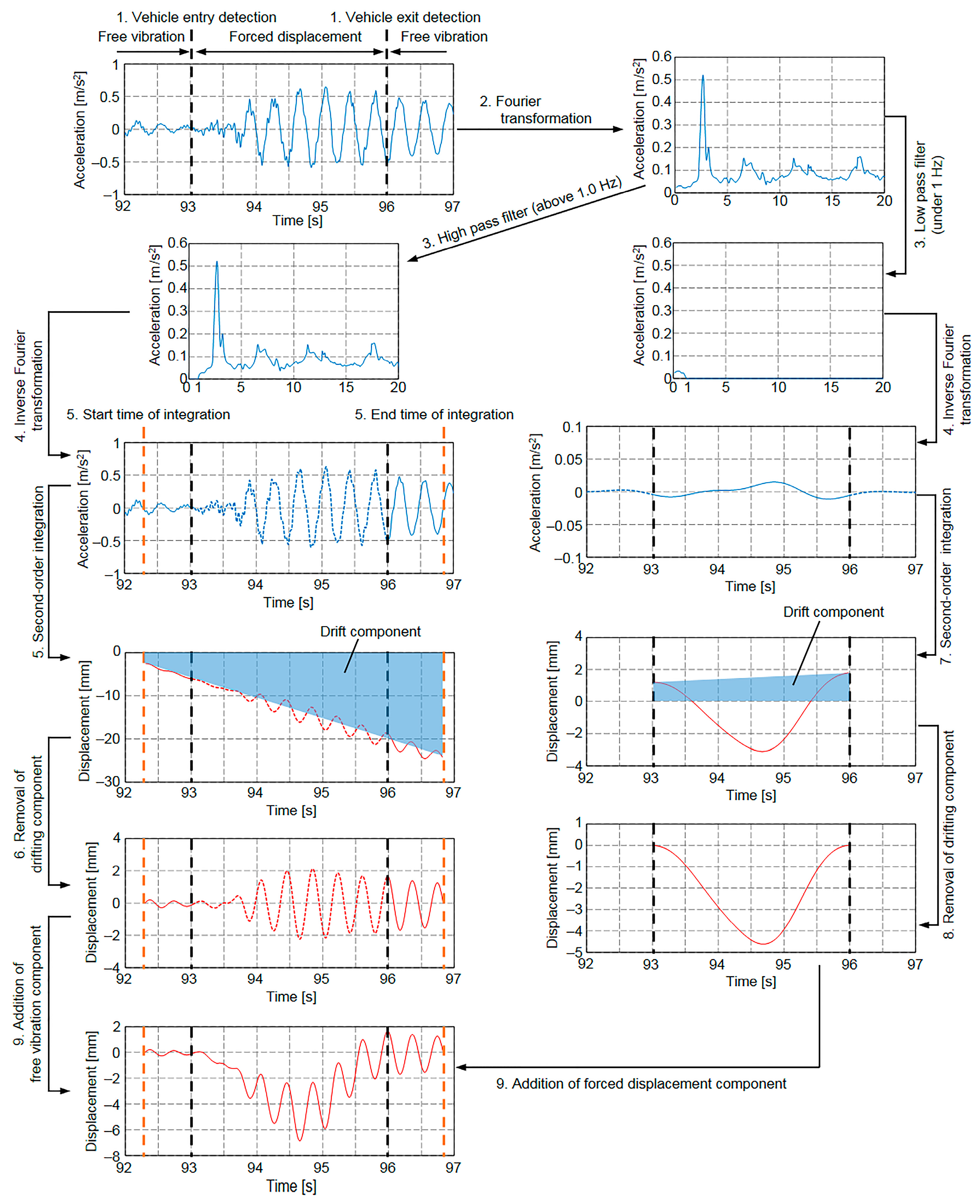 - By removing the frequencies below 1.0 Hz to eliminate the effect of forced displacement during vehicular passage, the acceleration of free vibration in the frequency domain is estimated. In the same manner, by removing the frequencies above 1.0 Hz to eliminate the effect of free vibration, the acceleration of forced displacement in the frequency domain is estimated.