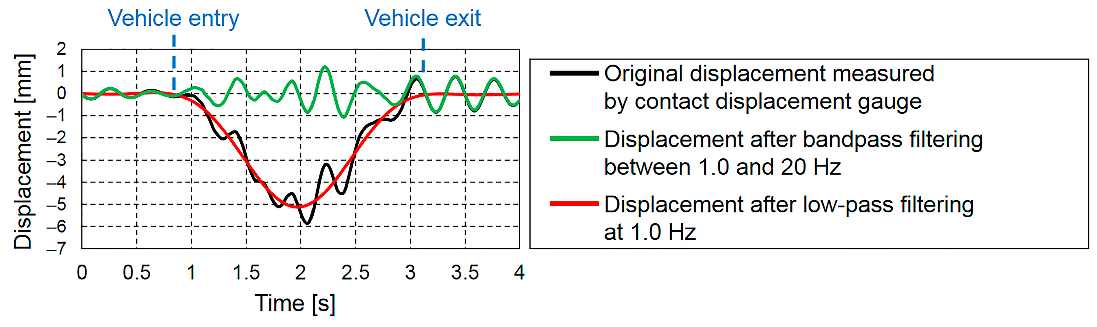Figure 8 shows the results of filtering the measured displacement shown in Figure 5 by separately applying a low-pass filter of 1.0 Hz and a bandpass filter between 1.0 and 20 Hz. Figure 8 also shows the original measured displacement. The displacement bandpass filtered between 1.0 and 20 Hz, which is the displacement of free vibration, vibrated about the zero-axis before vehicle entry and after vehicle exit. Conversely, the displacement low-pass filtered at 1.0 Hz, which is the forced displacement, started at a displacement of 0 mm when the vehicle entered bridge and returned to a displacement of 0 mm after the vehicle exited the bridge.